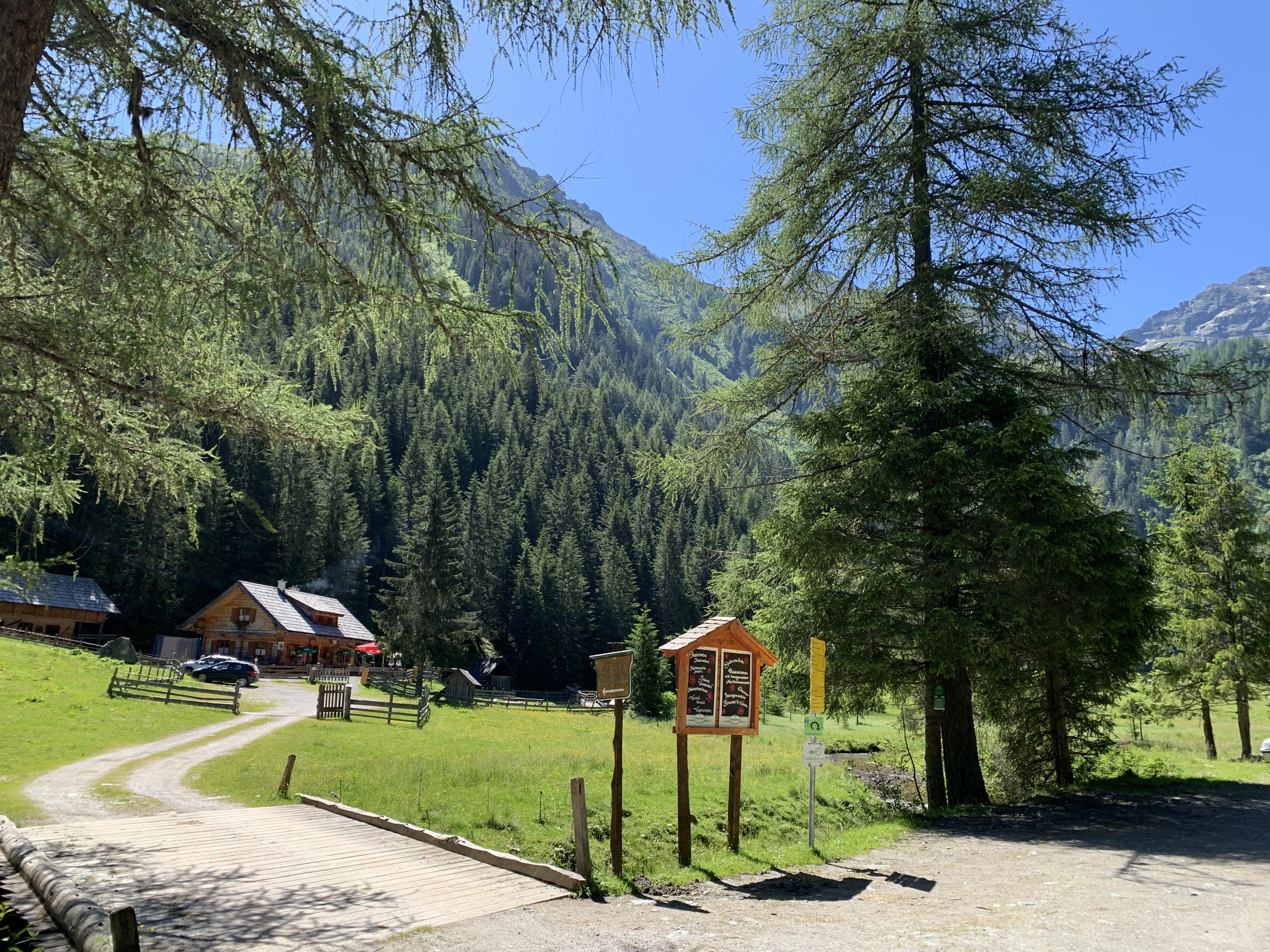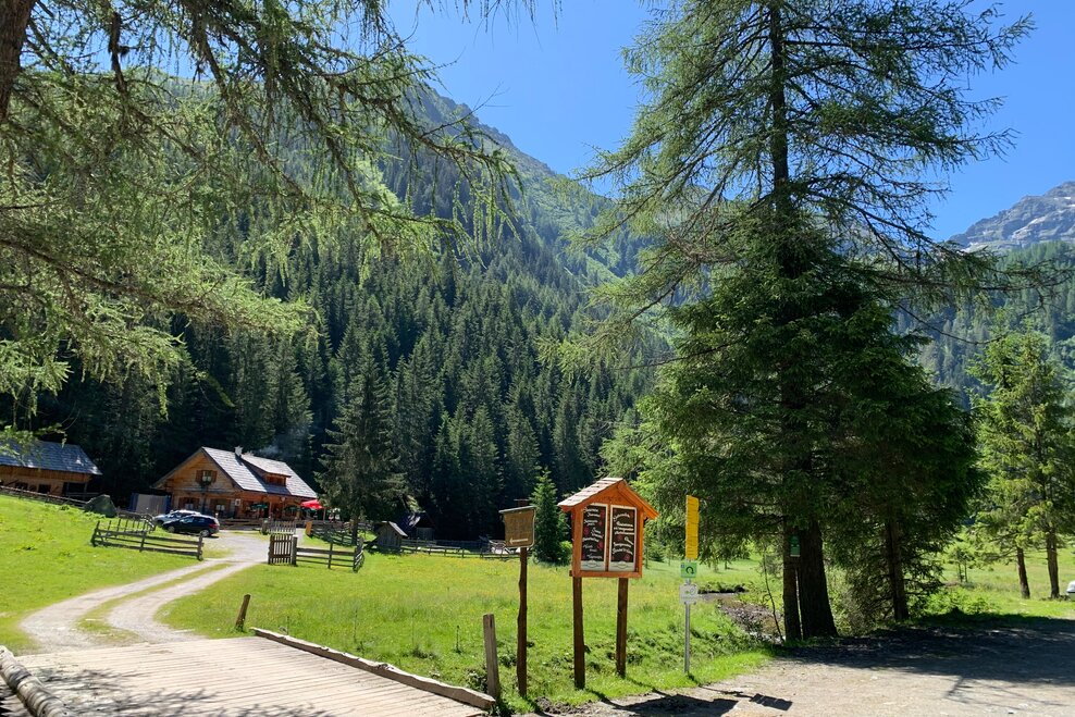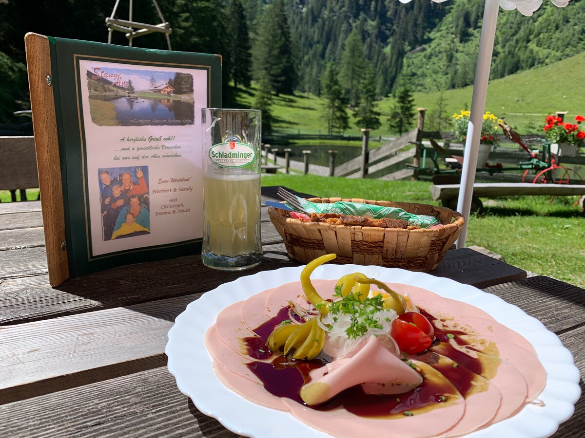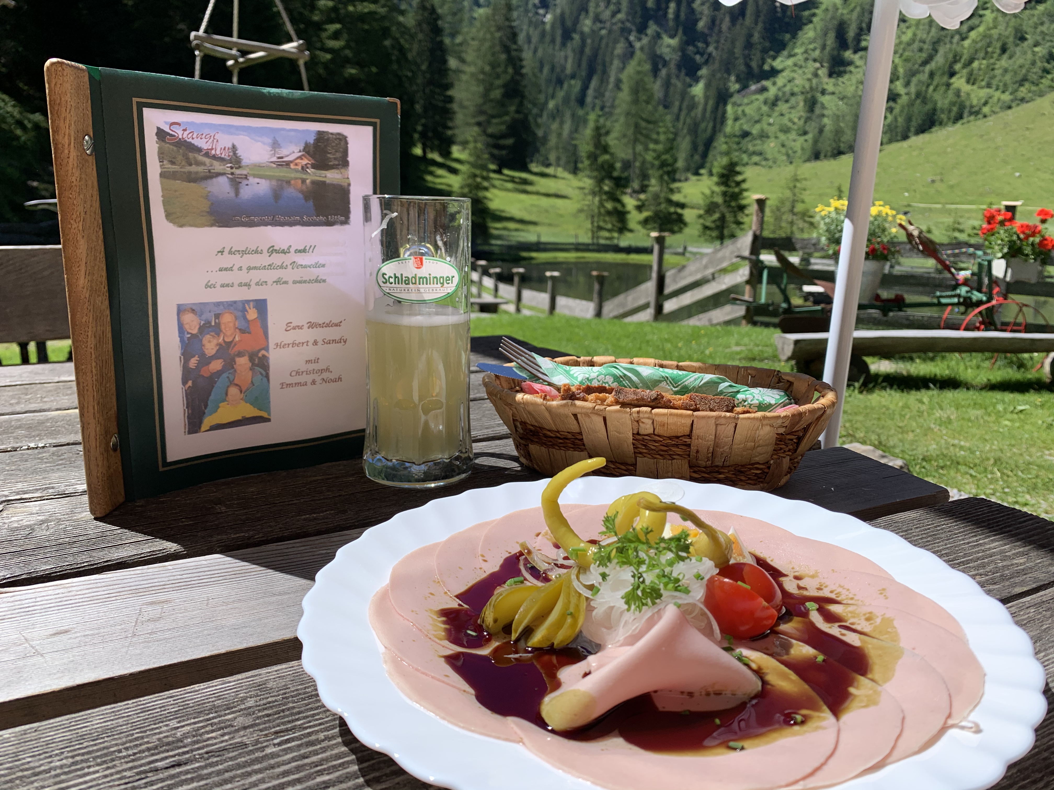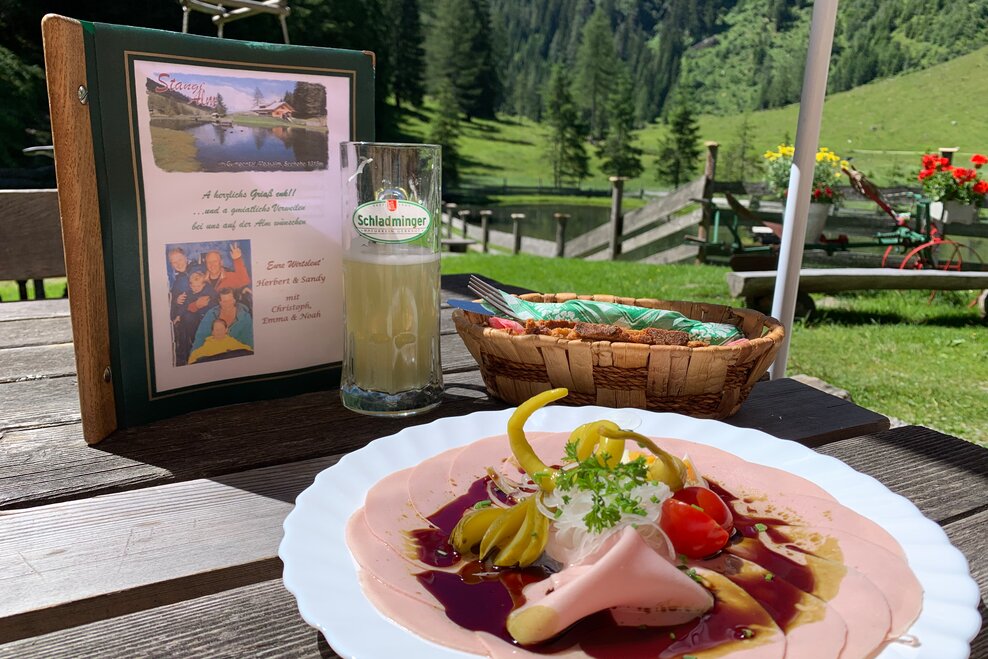 Bei der Ankunft im Gumpental empfängt uns der nächste Wegweiser, dieses Mal entscheiden wir uns für einen kurzen Abstecher in die "Stanglalm" und biegen daher nach rechts ab (links geht es weiter zum steirischen Bodensee). Nach ca. 500 Meter erreichen wir die schöne Hütte. Beim Anblick der Alm wird einem klar, hier ist der perfekte Ort für eine Stärkung: sonnige Lage mit toller Aussicht auf die Berge, auswahlreiche Speisekarte, kleiner aber feiner Spielplatz, freundliche Bedienung - definitiv alles da, was man für eine gemütliche Einkehr braucht. Tipp: Wer Zeit und Lust hat kann von hier aus zum idyllischen Moaralmsee wandern (zirka 50 Minuten Gehzeit).