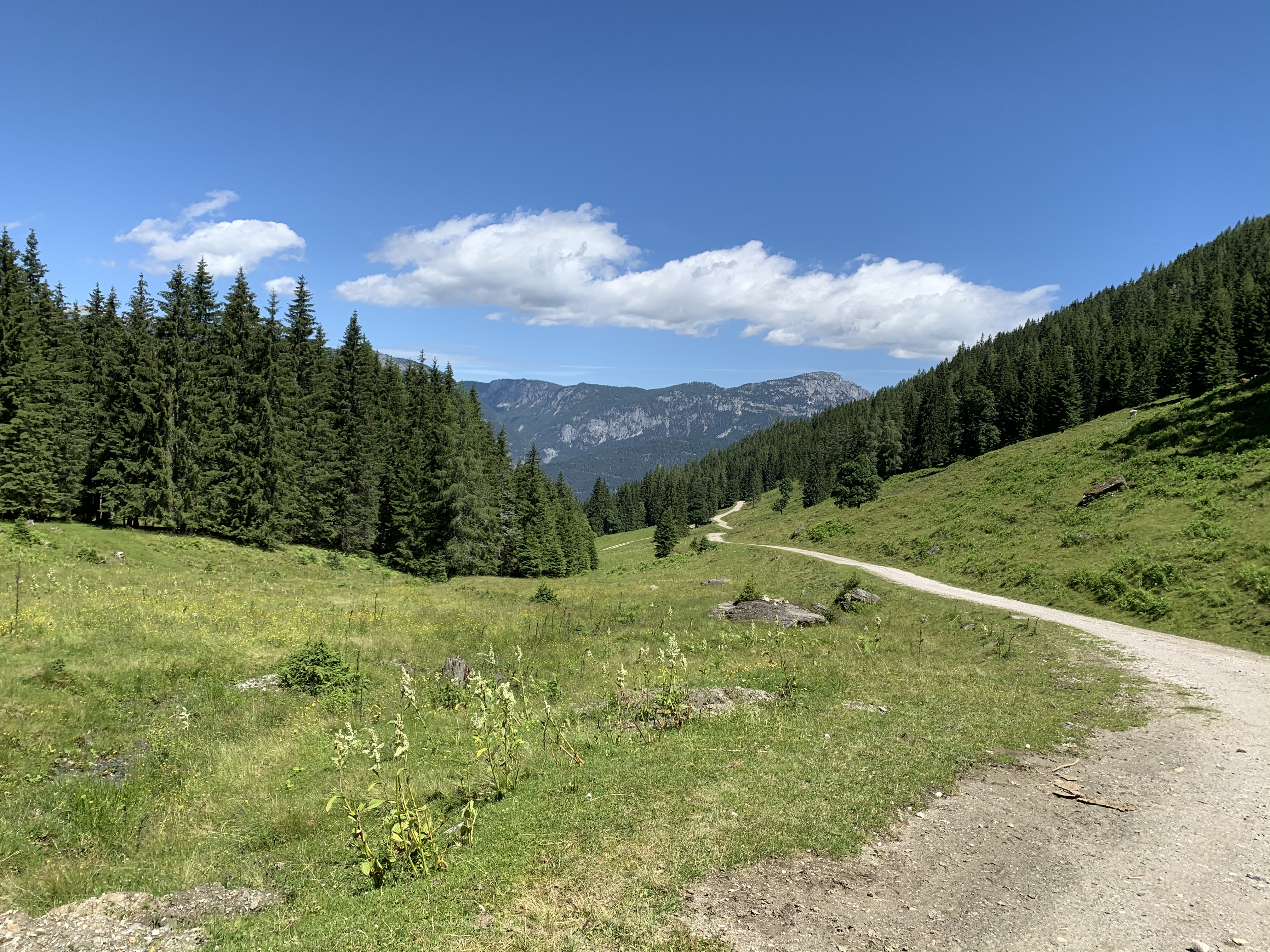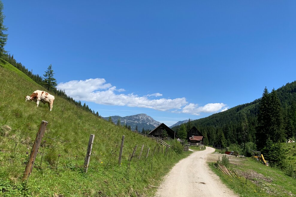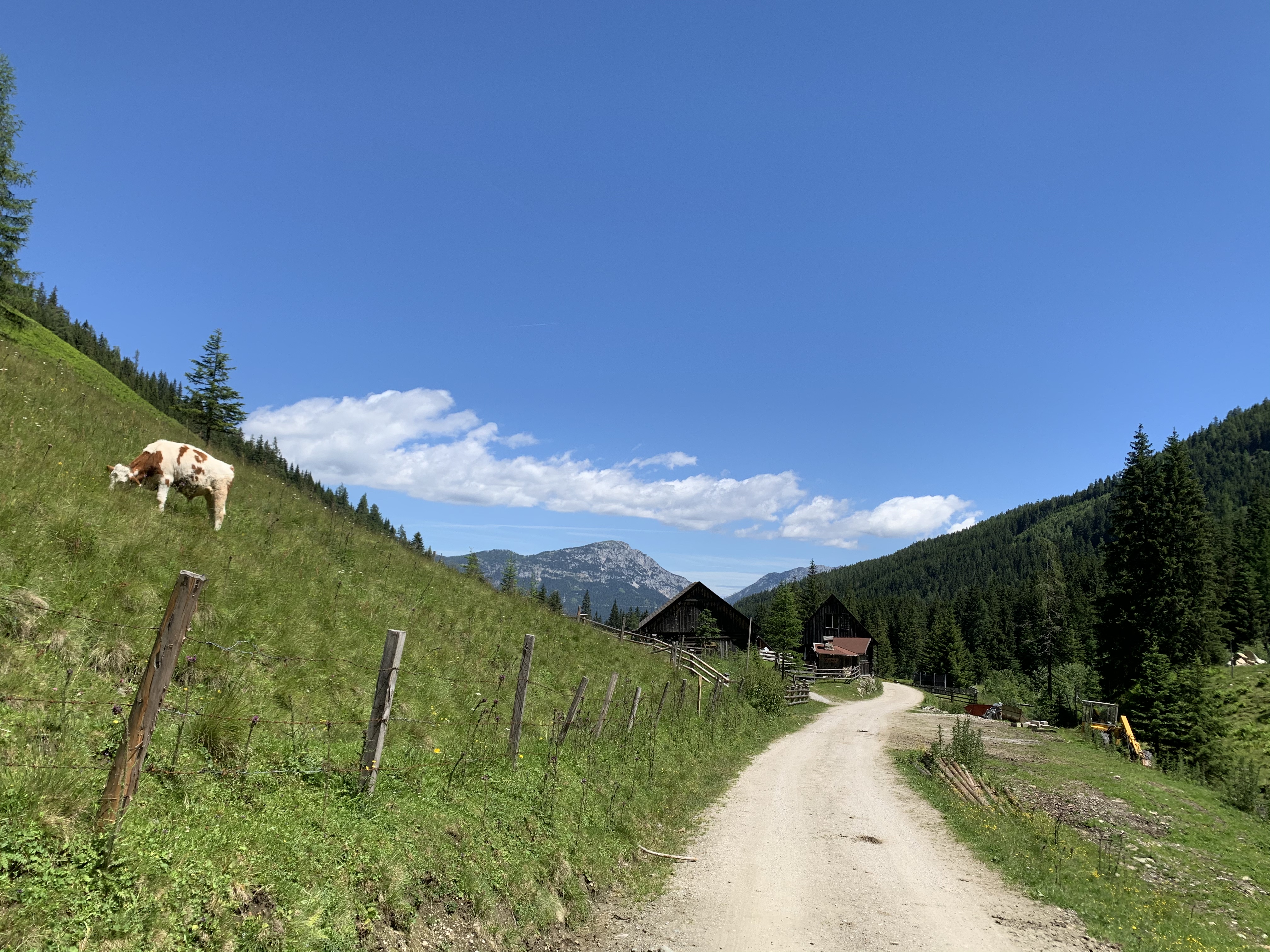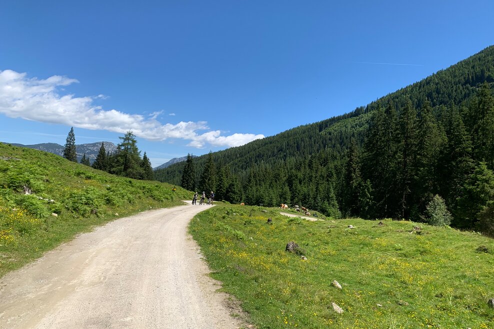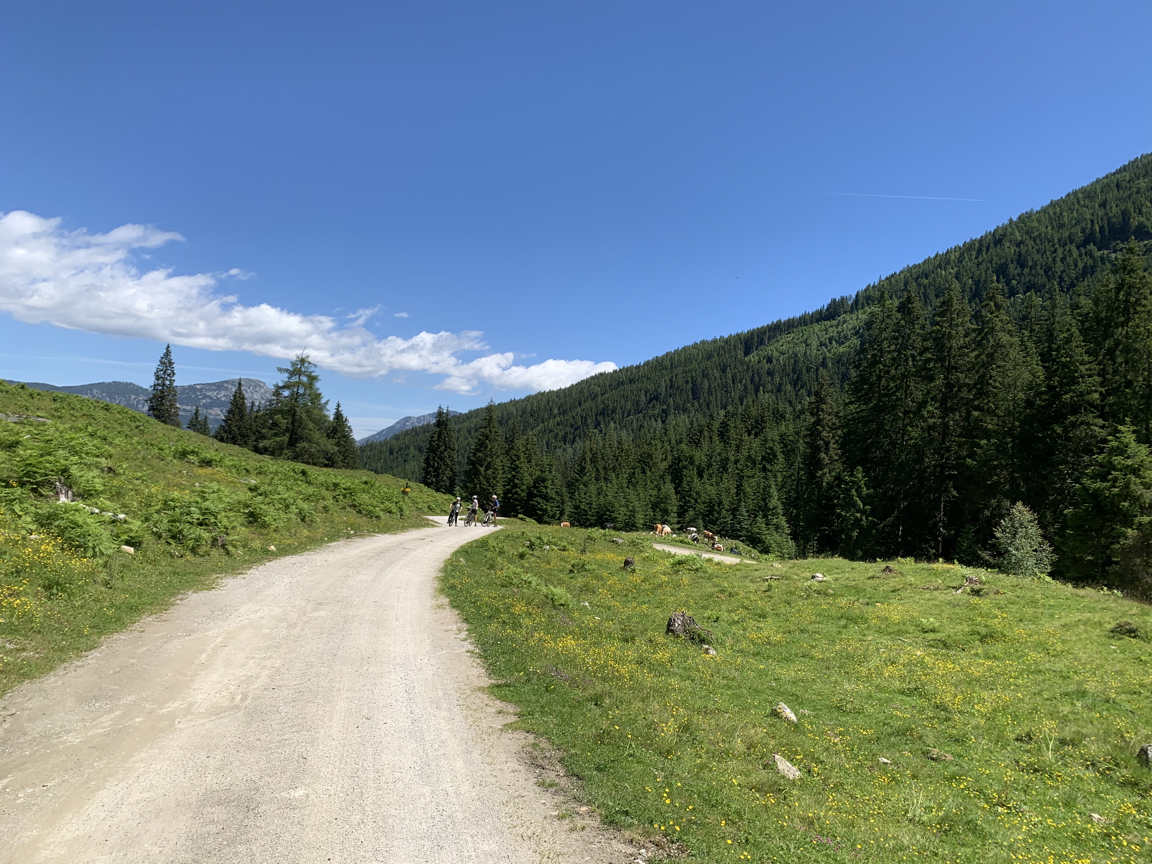 Mit geringem Höhenunterschied geht es über malerische Gras- & Forstwege weiter ins Gumpental. Eine gemütliche Tour mit einer eindrucksvollen Szenerie, welche uns zum Schwärmen bringt. Entlang des Weges sind wir auf Weidetiere getroffen. Die Kühe und Kälber sind spürbar an uns Radfahrer gewöhnt, nach einem kurzen Blick in unsere Richtung haben sie sich schnell wieder ihrer Lieblingsbeschäftigung - dem grasen - zugewand :-). Da ich bei Touren im Almgebiet immer einen kleinen Stecken - als reine Vorsichtsmaßnahme - an der Außenseite meines Rucksackes mit dabei habe, fühl ich mich sicher und freu mich so, so manche Vierbeiner aus der Ferne beobachten zu können.