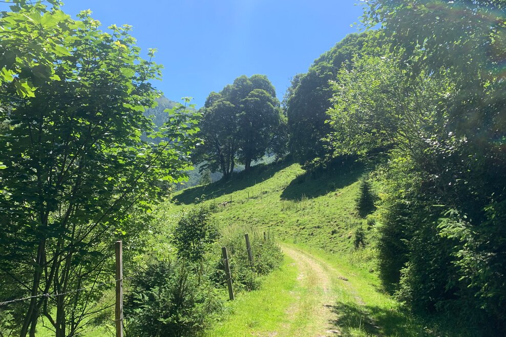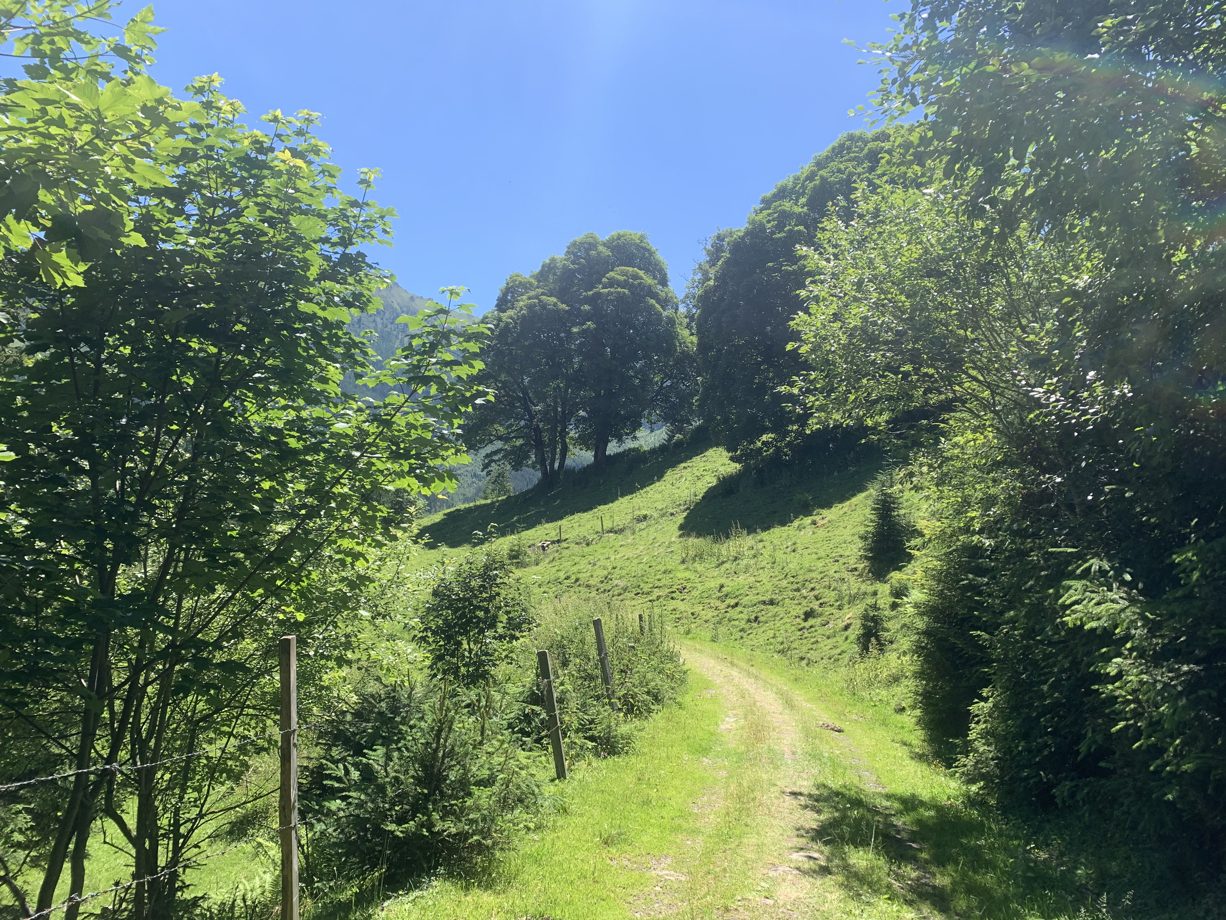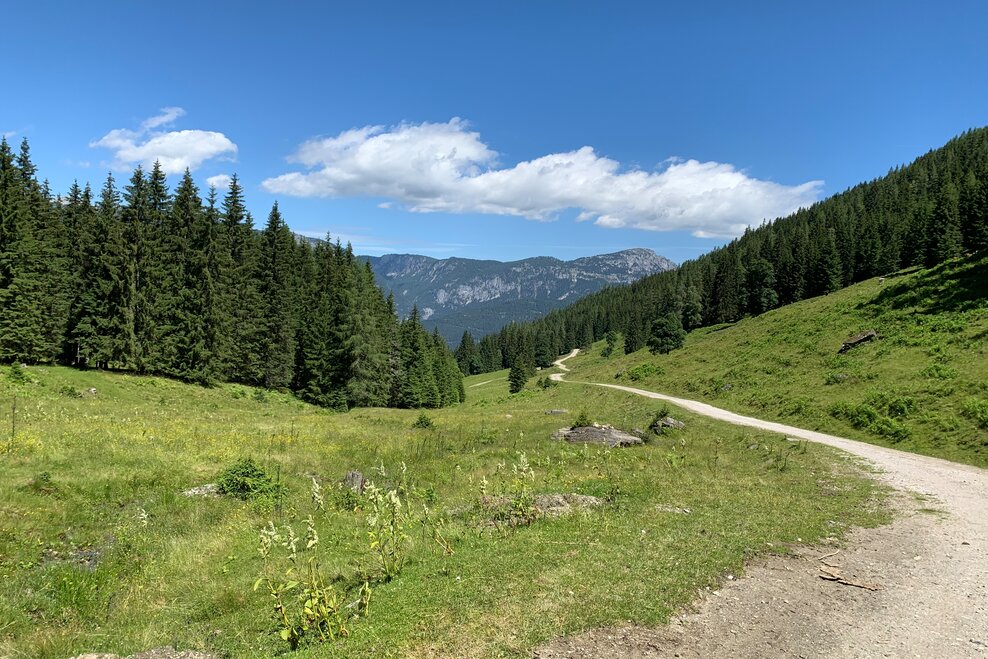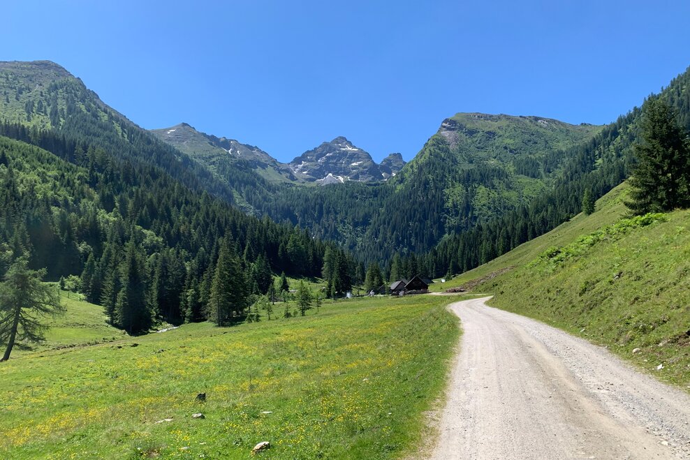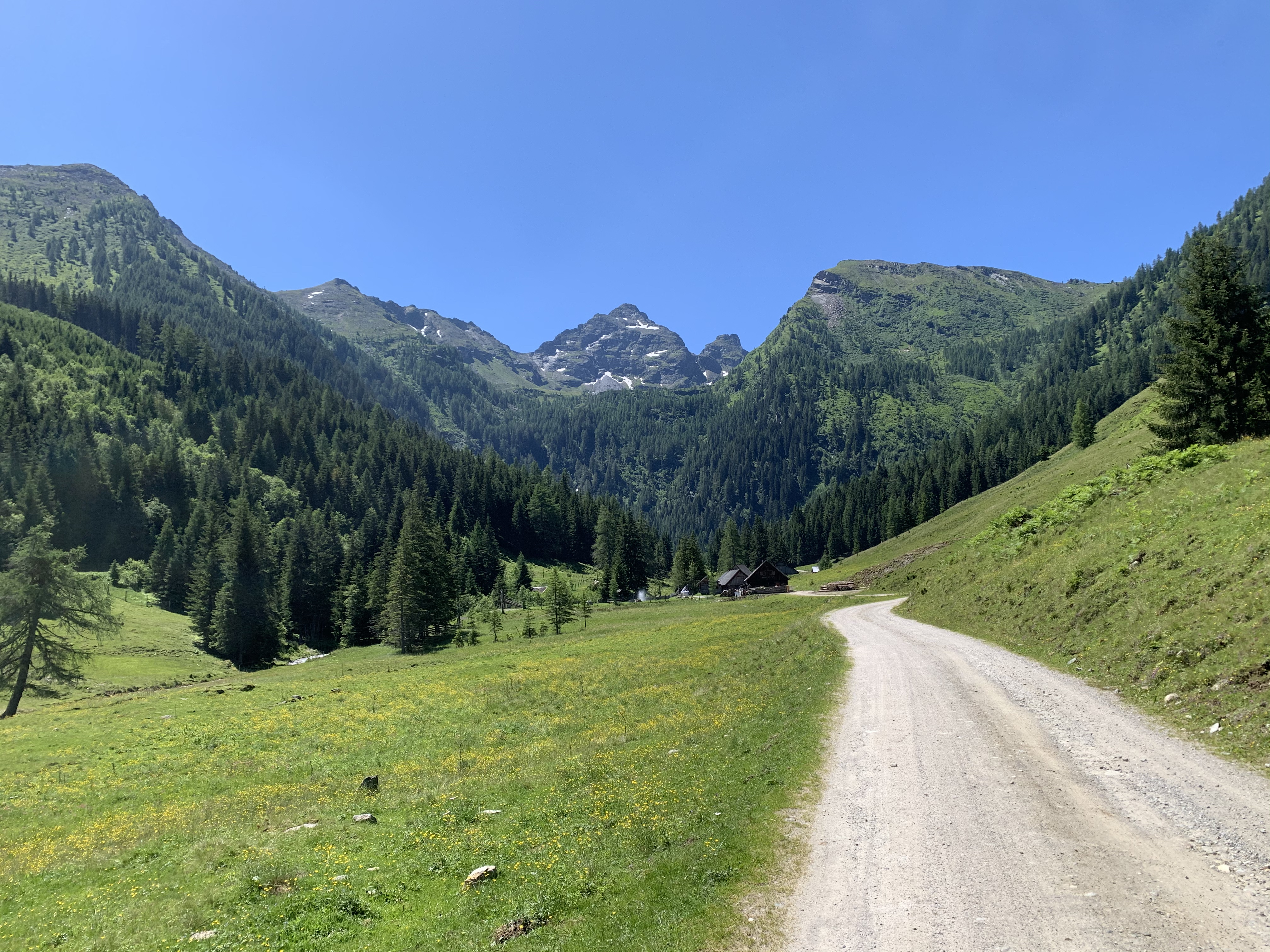 Mit geringem Höhenunterschied geht es über malerische Gras- & Forstwege weiter ins Gumpental. Eine gemütliche Tour mit einer eindrucksvollen Szenerie, welche uns zum Schwärmen bringt. Entlang des Weges sind wir auf Weidetiere getroffen. Die Kühe und Kälber sind spürbar an uns Radfahrer gewöhnt, nach einem kurzen Blick in unsere Richtung haben sie sich schnell wieder ihrer Lieblingsbeschäftigung - dem grasen - zugewand :-). Da ich bei Touren im Almgebiet immer einen kleinen Stecken - als reine Vorsichtsmaßnahme - an der Außenseite meines Rucksackes mit dabei habe, fühl ich mich sicher und freu mich so, so manche Vierbeiner aus der Ferne beobachten zu können.
