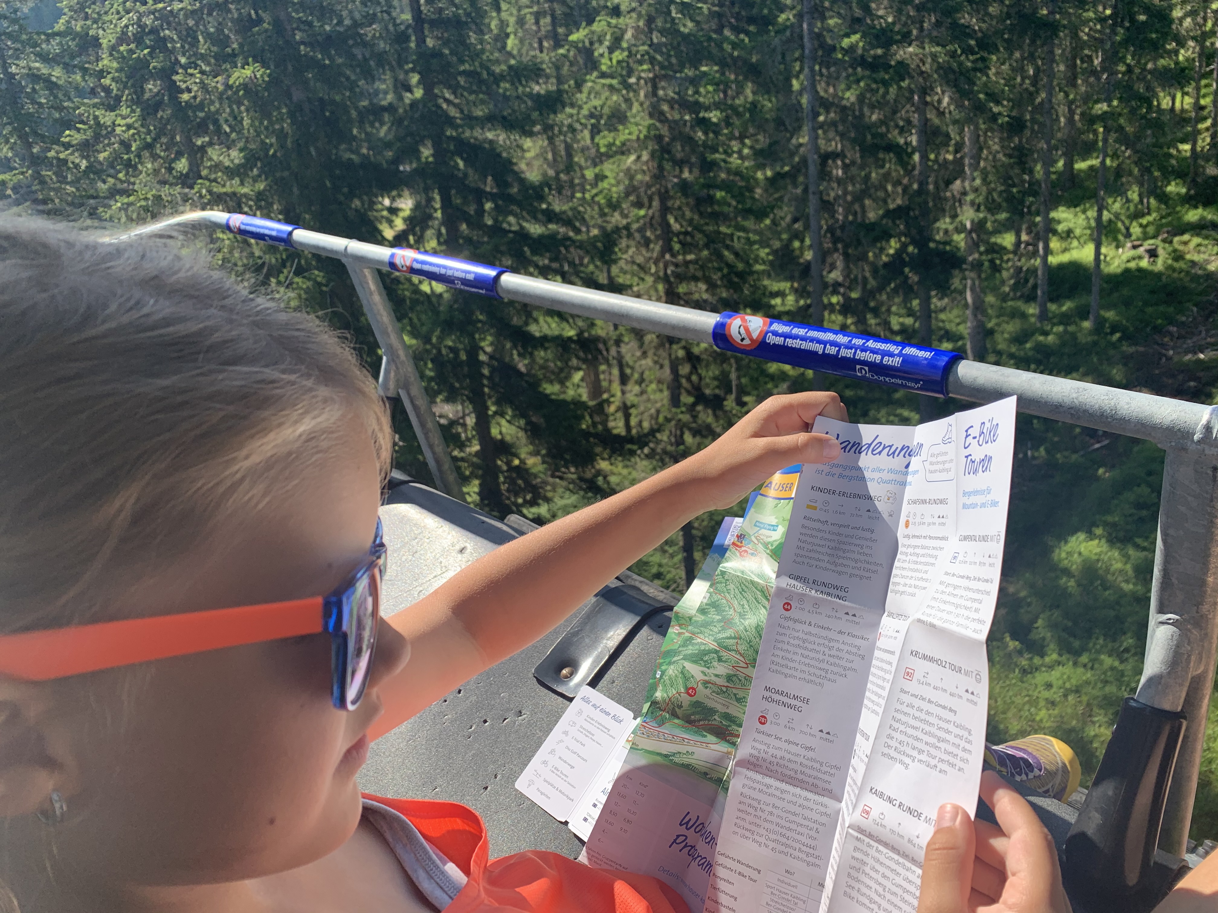 Wir starteten um ca. 9:30 an der 8er-Gondelbahn Talstation. Mit der Sommercard können wir gleich direkt zum Einstieg der Gondel, aber wir machen Halt an der Kassa. Denn der Rückweg führt über den Kinder-Erlebnisweg und dafür brauchen wir eine Rätselkarte, welche wir um 2,50 EUR von der netten Kassadame erhalten. Dass wir uns anschließend mit geknacktem Lösungswort eine kleine Überraschung bei der Kassa abholen können, lässt die Vorfreude nur noch mehr steigen. Ein weiterer Pluspunkt: Mit der Sommercard ist die Auffahrt kostenlos.