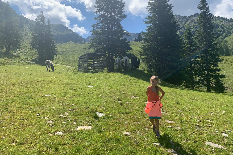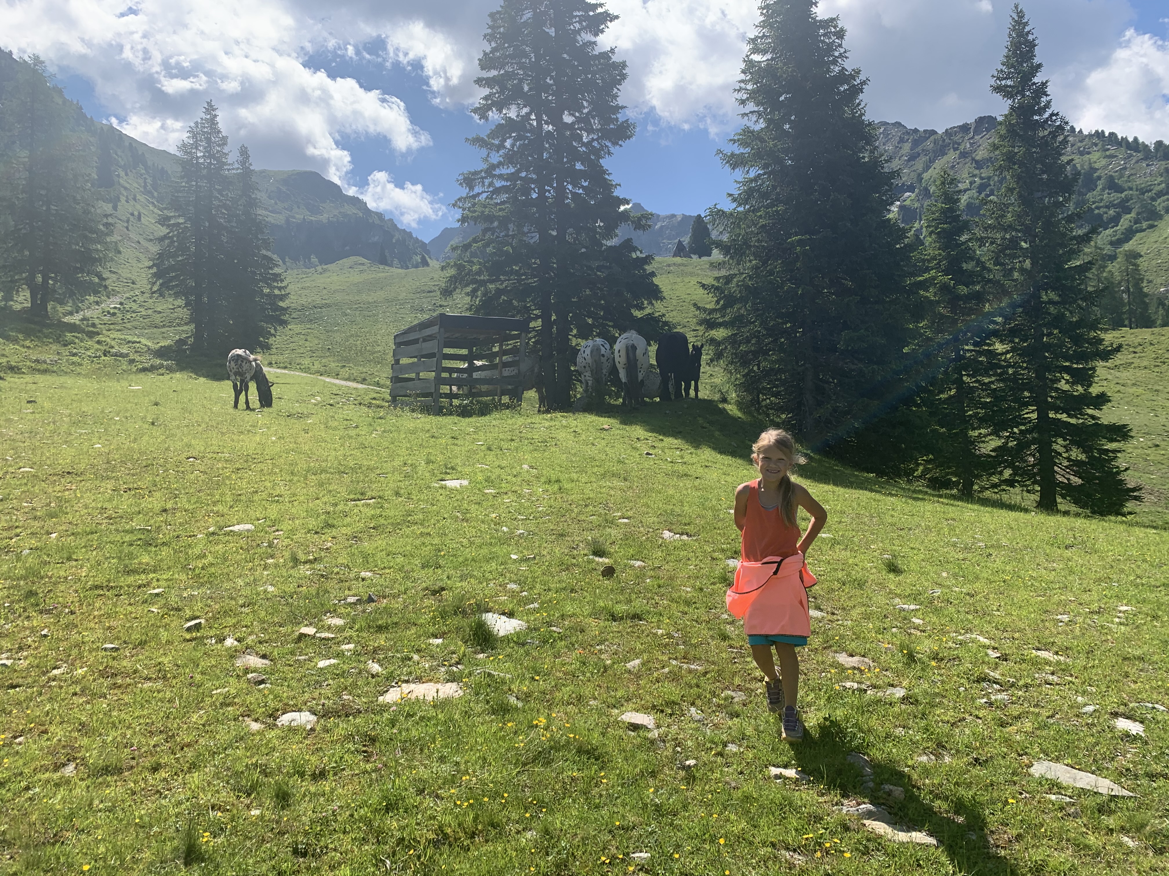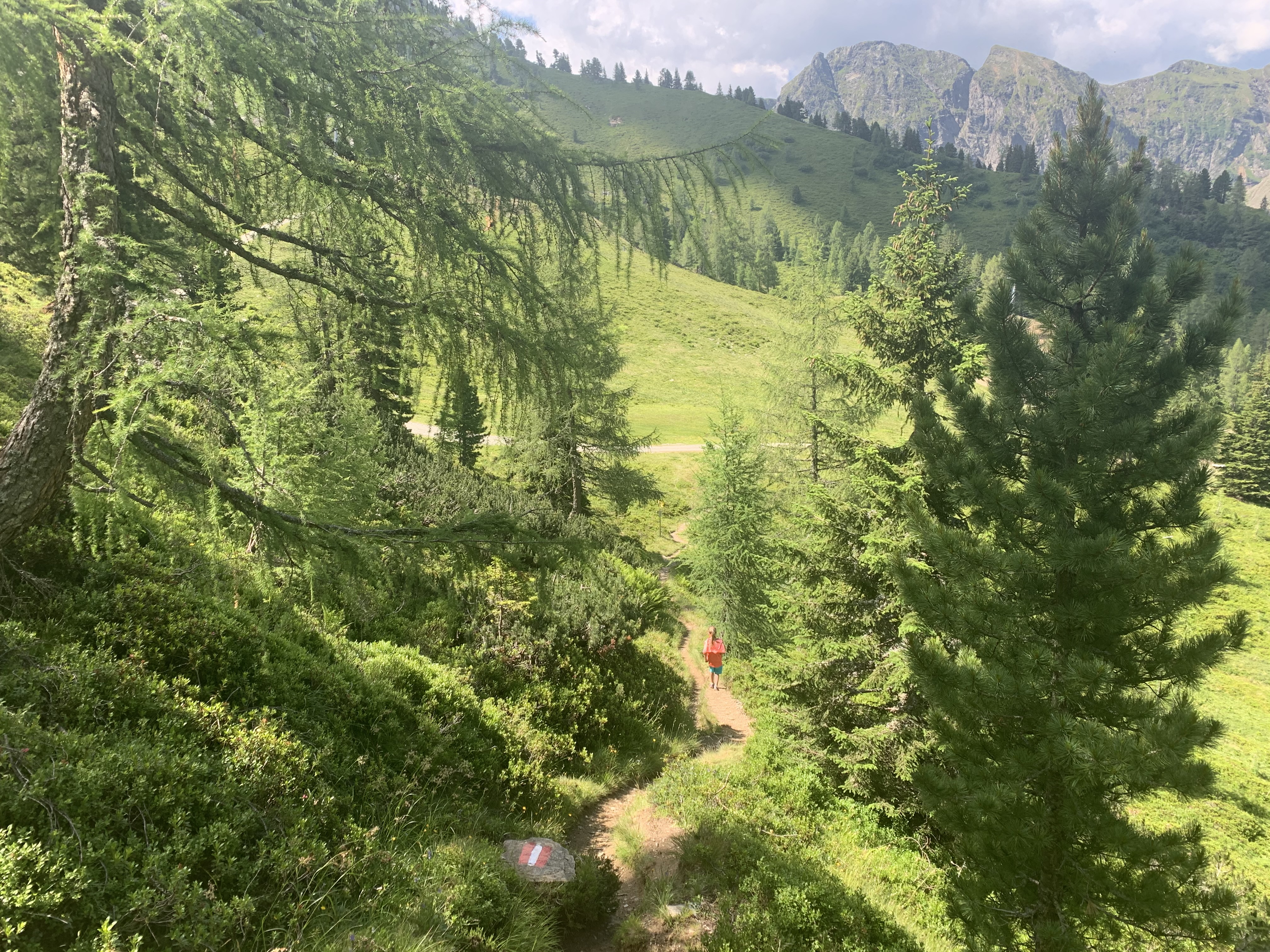 Von hier aus kann man weiter zum Moaralmsee, die Bärfallspitze, den Höchstein oder den Schafsinn-Rundweg zurück zum Senderplateau wandern. Wir entscheiden uns für den Abstieg in die wunderschöne Kaiblingalm. Wir bleiben immer am Weg Nr. 44.