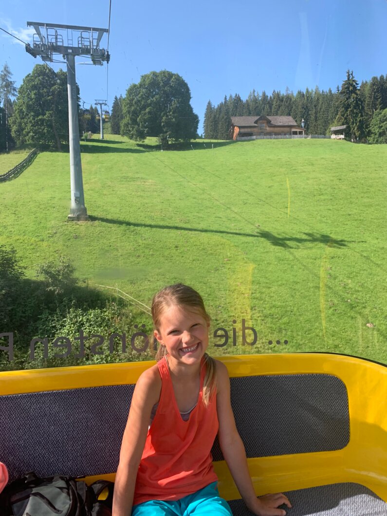 Die vielen Spielgeräte am Senderplateau müssen wir diesmal leider auslassen, wir fahren mit der Sesselbahn zurück zur Mittelstation. Und ich muss euch sagen: das Bergab-Fahren mit der Sesselbahn ist noch viel aufregender ;-) Beim Platzhirsch gab’s dann noch, wie versprochen, eine Eistüte mit 2 Kugeln Eis, welches wir in der Gondel verspeisen durften – wir haben natürlich aufgepasst und nicht gekleckert ;-)