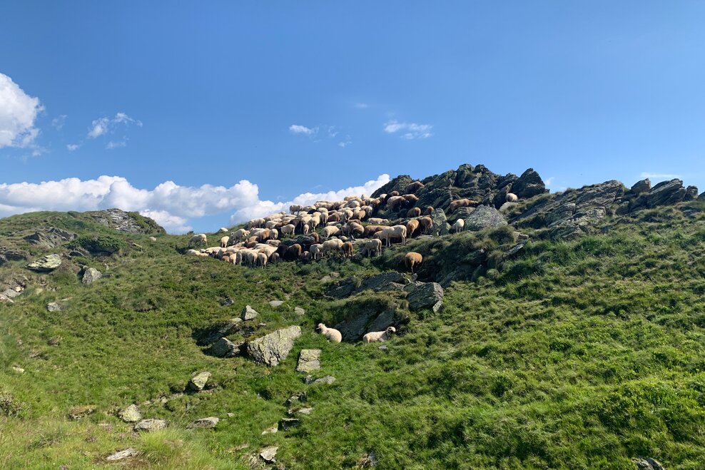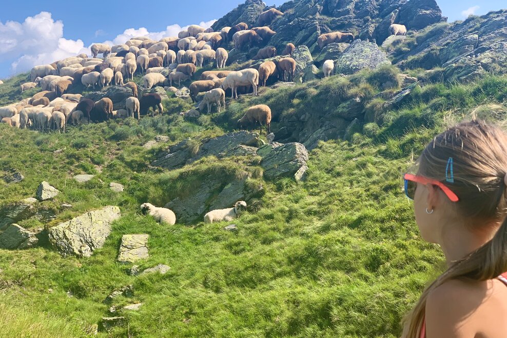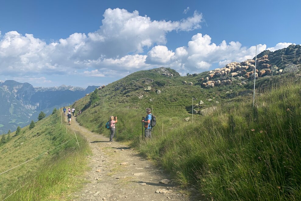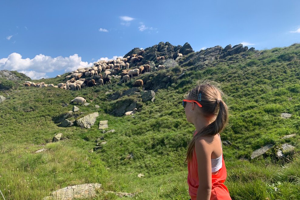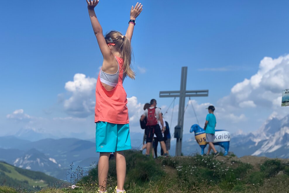 An der Quattralpina Bergstation startet gleich links neben dem Ausstieg der Weg Nr. 44 Richtung Gipfel. Der Hauser Kaibling ist der der höchste Punkt der Schladminger 4-Berge-Skischaukel und mithilfe der Seilbahnen rasch zu erreichen. Der Wanderweg ist breit und mit leichten Anstiegen versehen. Einen faszinierenden Weitblick auf das wunderschöne Steirische Ennstal mit seinen markanten Gipfeln wie den Dachstein (2.995), Höchstein (2.543), oder den Grimming (2.351) gibt's obendrauf. Für Mia war aber eher die große Schafherde interessant, welche uns am Gipfelweg begegnete.