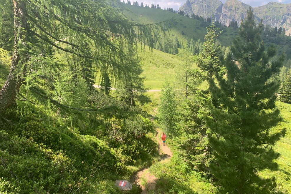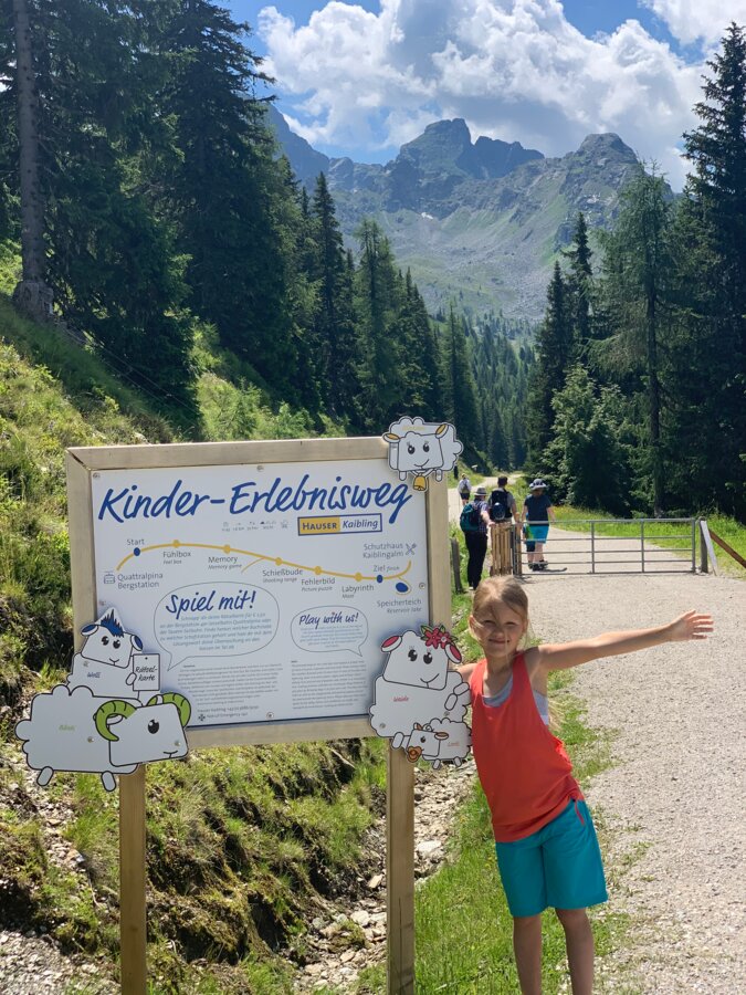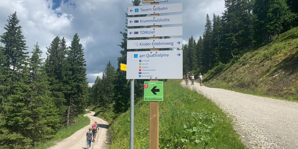 Für den Rückweg von der Kaiblingalm stehen uns dann zwei Wege zur Verfügung: Der sehr flach verlaufende Weg welcher an der Gipfelbahn Talstation vorbei zum TOMiziel, der Krummholzhütte und Tauern-Seilbahn Bergstation führt. Oder, wie von uns schon vorher festgelegt, der Kinder-Erlebnisweg (mit leichtem Anstieg zu Beginn) zurück zur 4er-Sesselbahn Quattralpina Bergstation.