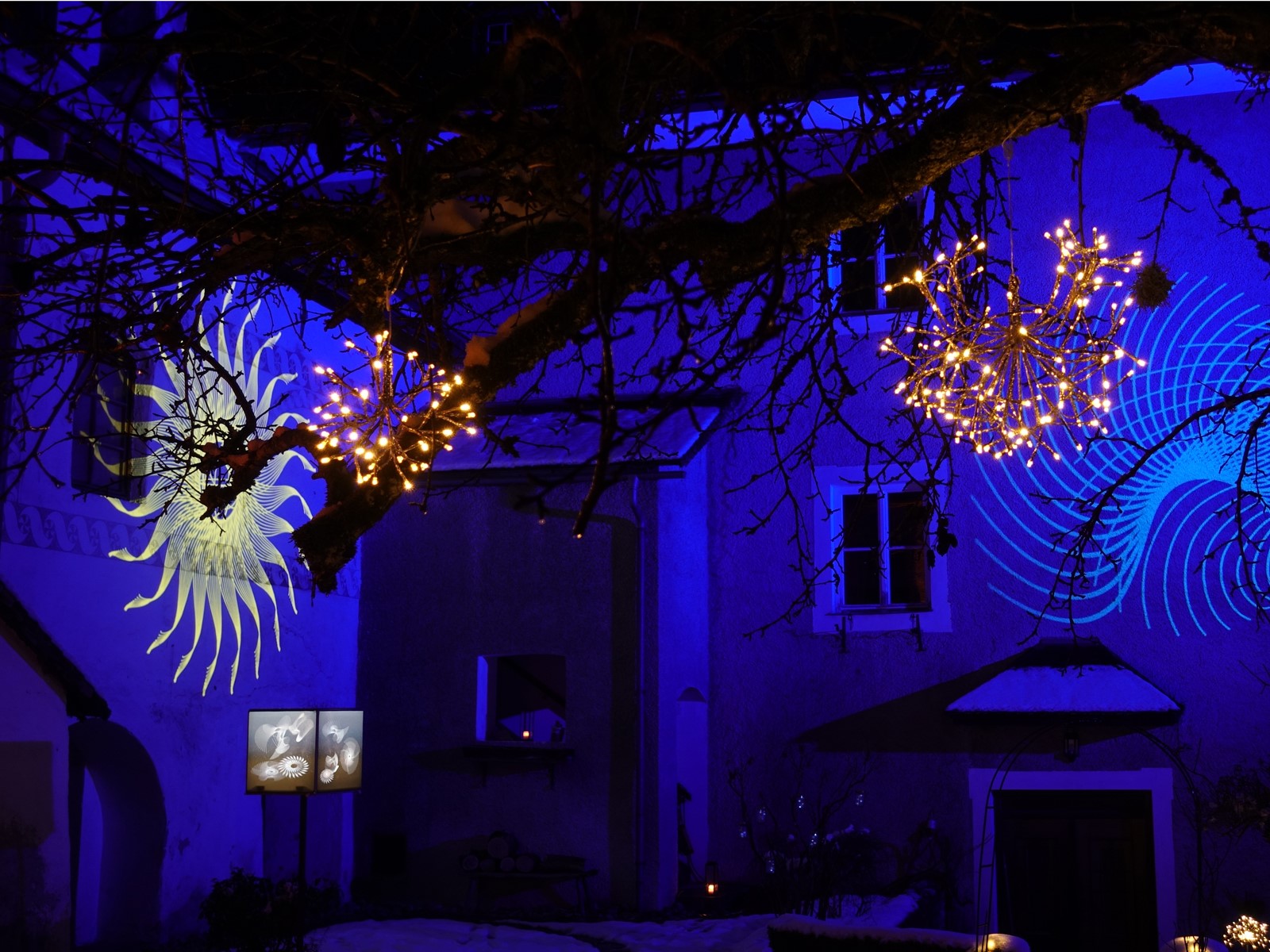 Schon beim Eintreffen am Schlossplatz begrüßt mich eine Videoprojektion mit ruhiger Hintergrundbeschallung, die einstimmt auf den vor mir liegenden Lichterpfad. Als "Leinwand" dient die Fassade des Schlosses. Stehen bleiben, inne halten, runterkommen und einfach wirken lassen.