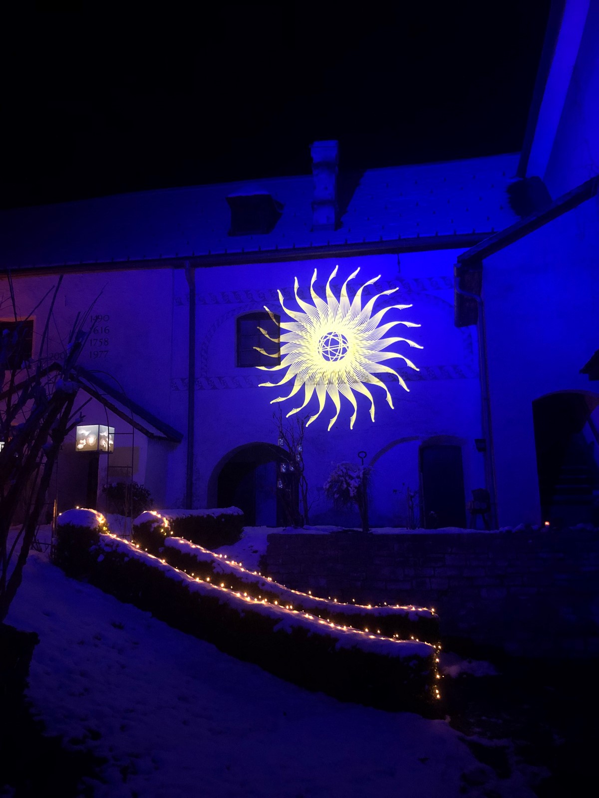 Und so gehe ich über den Friedhof retour auf den Schlossplatz, wo ich zum Ausklang nochmals die Videoprojektion auf mich wirken lasse.