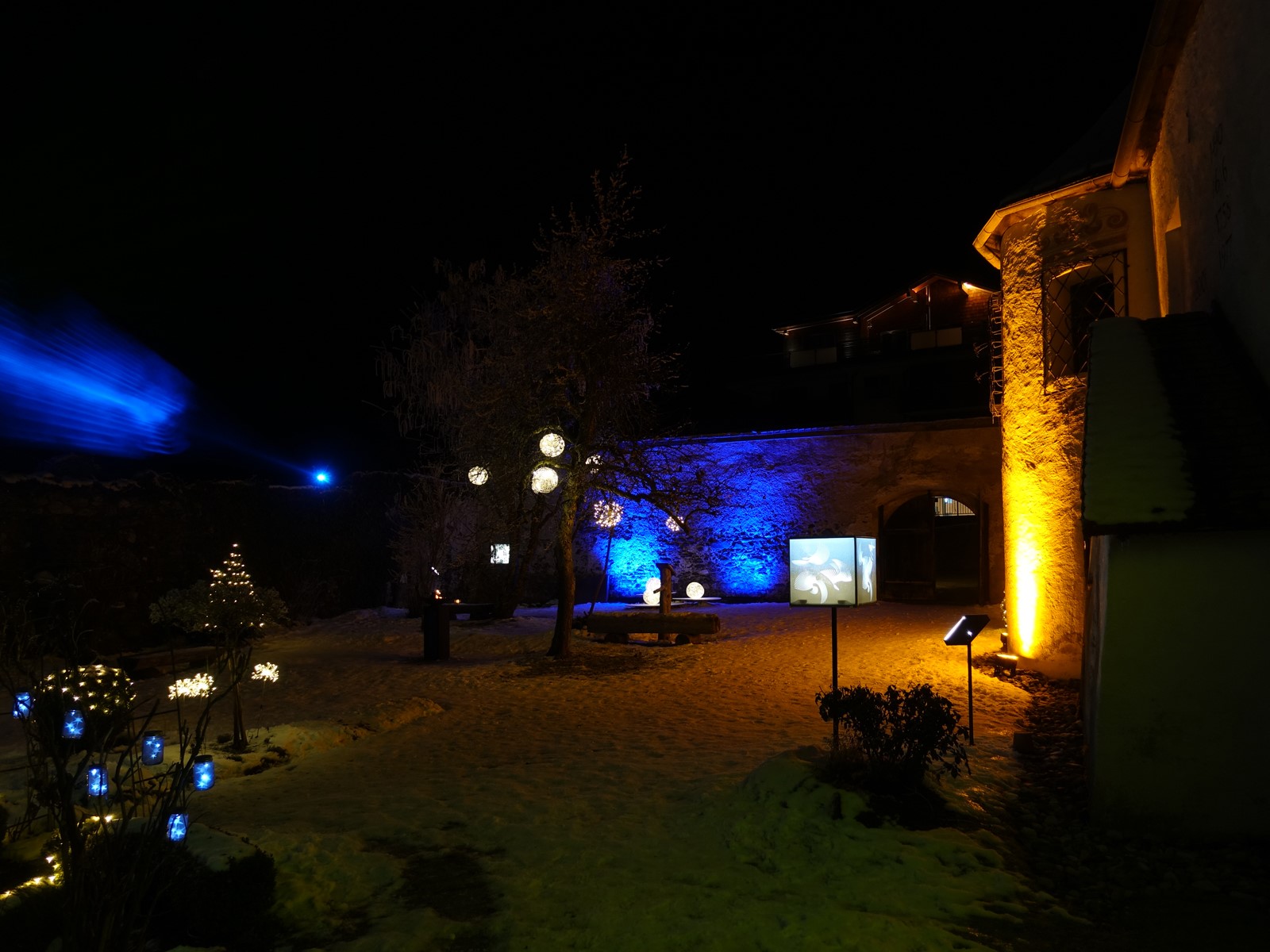 Somit bin ich im Pfarrgarten angekommen und lass die verschiedenen Beleuchtungen, Lichterspiele, Projektionen und liebevollen Details auf mich wirken.