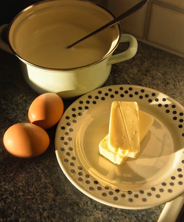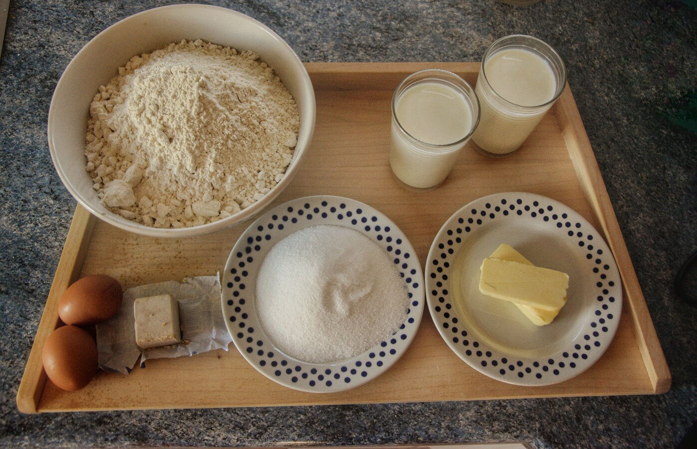 In der Zwischenzeit kann die Butter in der lauwarmen Milch geschmolzen werden, ehe man die Dotter unterrührt. In einer großen Schlüssel werden außerdem alle trockenen Zutaten, sprich das Mehl, der Zucker und eine Prise Salz vermischt.