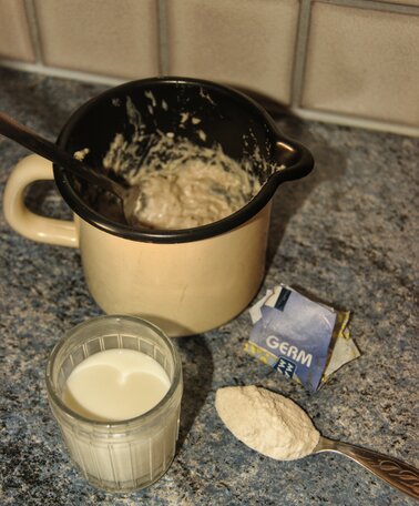 Seitdem ich im Rahmen des Kochunterrichts meinen ersten Allerheiligenstriezel zubereitet habe, kommt er nun jedes Jahr frischgemacht auf den Tisch. Selbstgebacken schmeckt er halt noch allemal am besten! Im ersten Schritt wird das „Dampferl“ hergestellt. Dafür zerbröselt man den Germ und rührt ihn mit einem Teelöffel Zucker und etwas lauwarmer Milch glatt. Anschließend wird noch ein Esslöffel Mehl untergehoben und die Masse für rund 20 Minuten an einem warmen Ort stehen gelassen.