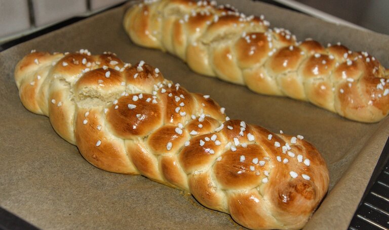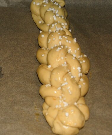 Die geflochtenen Zöpfe werden anschließend mit Ei bestrichen und nach Belieben mit Hagelzucker verziert, ehe sie bei 170 Grad für ca. 30 Minuten in den Ofen kommen bis sie goldbraun gebacken sind.