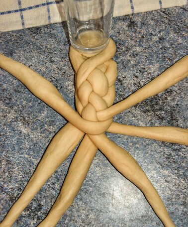 Aller Anfang ist schwer - Auf den ersten Blick sieht das Flechten des 6-er-Zopfes ziemlich kompliziert aus, doch hat man einmal den Dreh raus geht es ruckzuck. Alle Stränge werden, wie auf dem Bild ersichtlich, zu einem Bündel zusammengenommen und so aufgeteilt, dass rechts und links jeweils drei Stränge liegen und in der Mitte etwas Platz freibleibt. Für den besseren Halt kann an den Beginn des Striezels auch ein Glas daraufgestellt werden. Nun wird der rechte äußerste Strang in die Mitte gelegt und der linke, mittlere Strang nach rechts oben gelegt. So zieht man es abwechselnd bis zum Schluss durch – der Äußerste kommt in die Mitte, der Mittlere nach außen...
