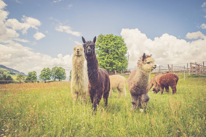 Classic, Wooly, Huacaya, Suri … von wollig bis Rasterlocken sind bei den Tieren am Klausnerhof (2/3 Alpaka, 1/3 Lama) alle Rassen der beiden Tier-Arten vertreten.