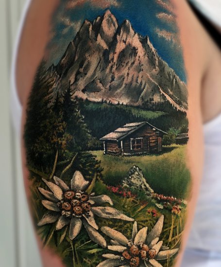 Die feinere Arbeit ermöglicht natürlich auch andere Motive. Unter anderem waren auch schon Landschaften, Traktoren und dergleichen dabei. „Das hat mir den Beinamen „Heimat-Tätowierer“ gebracht, aber das finde ich eigentlich sogar ganz schön“.