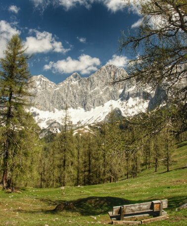 Egal zu welcher Jahreszeit, der Brandriedl mit Blick auf das imposante Dachstein-Dreigestirn ist immer einen Besuch wert. Diese Rundwanderung bietet eine ideale Einstiegstour in die Wandersaison. Vom Wanderparkplatz beim Gasthaus Edelbrunn ausgehend, führt Dich der Roseggersteig zum Brandriedl. Wer würde hier nicht gerne Platz nehmen und das Frühlingserwachen genießen? Am Rückweg empfiehlt sich außerdem ein Abstecher beim Dachsteinkircherl.