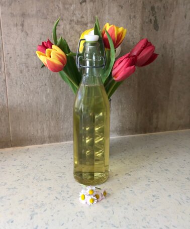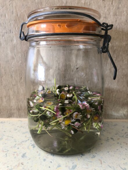 - Die frischen Blüten in einem Sieb kurz mit Wasser abspülen – dann in ein sauberes Glas mit Schraubdeckel füllen, mit ½ Liter kaltem Wasser übergießen und über Nacht stehen lassen