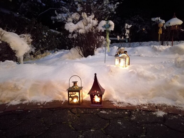 Dann ist es soweit, wir gehen. … Am Weg ins Dorf treffen wir die Nachbarn und wir gehen gemeinsam weiter. In den Kinderaugen sieht man die Freude. Jeder redet mit jedem und tauscht seine Gedanken aus. Wir treffen uns alle bei dem Haus wo die „Maria“ eine Nacht verbringen durfte. Von da geht es mit der „Maria“ zum nächsten Haus. Jeder stellt seine Laterne vor der Haustür ab und geht hinein.
