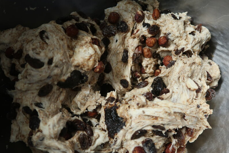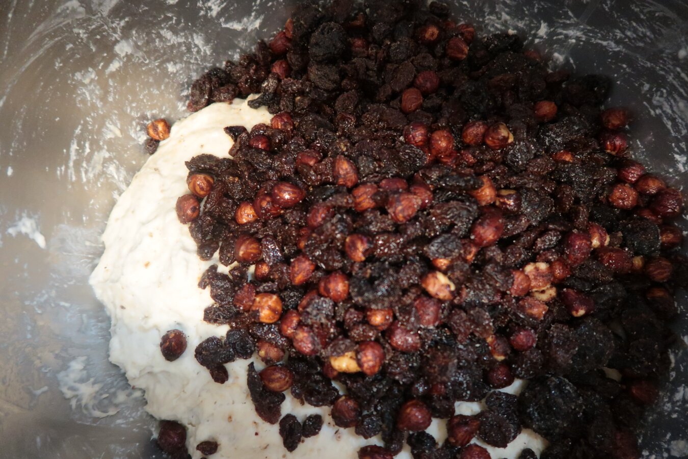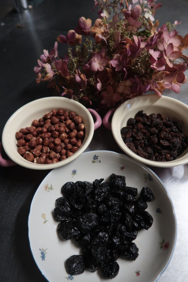 - Währenddessen Haselnüsse, Dörrpflaumen, Rosinen, Anis, Lebkuchengewürz und Rum zu einer saftigen Masse vermischen und ziehen lassen.