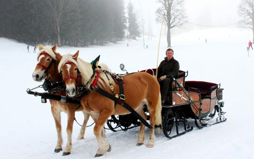 Die Pferdeschlittenfahrt hat ihren Ursprung im Alltag. „Früher gab es noch keine Schneeräumung. Im Winter war der Pferdeschlitten das beste Fortbewegungsmittel, um etwa in die Kirche oder zum Einkaufen zu kommen“, sagt Hans. Irgendwann hätten alte Bauern nach einem Nebeneinkommen gesucht und schließlich begonnen, ihre Hausgäste mit Pferdeschlitten durch die Ramsau zu kutschieren. Das war in der Zeit von Hans‘ Großvater. „Er war einer der ersten, die Pferdeschlittenfahrten für Gäste angeboten haben.“ Nach einiger Zeit hat Hans‘ Vater die Schlittenfahrt weiter betrieben, bis es vor knapp zwanzig Jahren für Hans an der Zeit war, die Zügel zu übernehmen. Auch sein Nachfolger steht bereits fest. „Mein 21-jähriger Sohn hat gerade den Fahrkurs gemacht, bei dem junge Kutscher die richtige Anspannung lernen.“ Ans Aufhören denkt er noch nicht – in Zukunft will der Ramsauer gemeinsam mit seinem Sohn zwei Gespanne führen. „Die Nachfrage ist derzeit so hoch, eigentlich würden wir fünf Gespanne benötigen.“