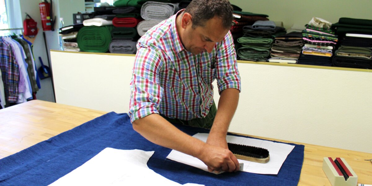 Licht dringt durch die Fenster, trotz des Sommertages ist es in der Werkstatt kühl. Die Nähmaschine rattert, die Schere schneidet, hie und da wird etwas angezeichnet. Manche Stoffabschnitte liegen am Boden, andere am großen Arbeitstisch – die Kunden draußen im Geschäft bekommen nichts davon mit. Trotzdem könnten diese lose herumliegenden Stoffstücke eines Tages ihr eigener, maßgeschneiderter Anzug werden.