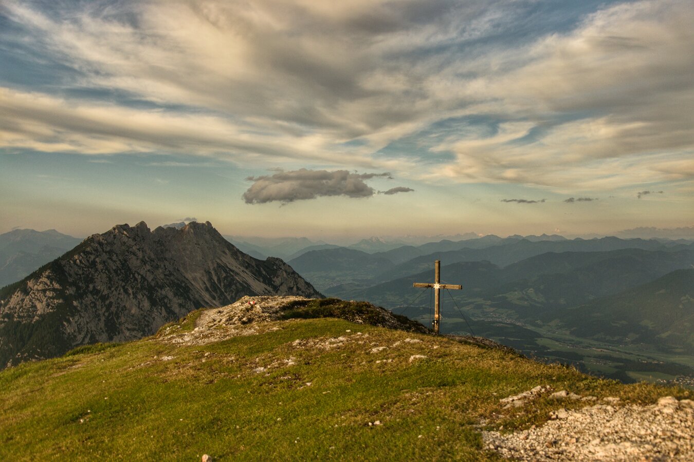 Mit seinem einmaligen 360 Grad Panorama vom mächtigen Dachstein, über das Ennstal und den Schladminger Tauern, weiter ins steirische Salzkammergut bis zu den Bergen des Gesäuses, ist der Stoderzinken ein traumhafter Berggipfel, um den Sonnenuntergang zu erleben. Allein schon die Anfahrt über die Stoderzinken Alpenstraße ist ein Erlebnis. Vom Parkplatz ausgehend erreicht man in etwa 50 Minuten den Gipfel. Ein weiterer Aspekt, der den Stoderzinken für mich zu einem beliebten Ziel für eine Sonnenuntergangswanderung macht, da man durch den kurzen Rückweg noch vor Einbruch kompletter Dunkelheit das Auto erreicht.