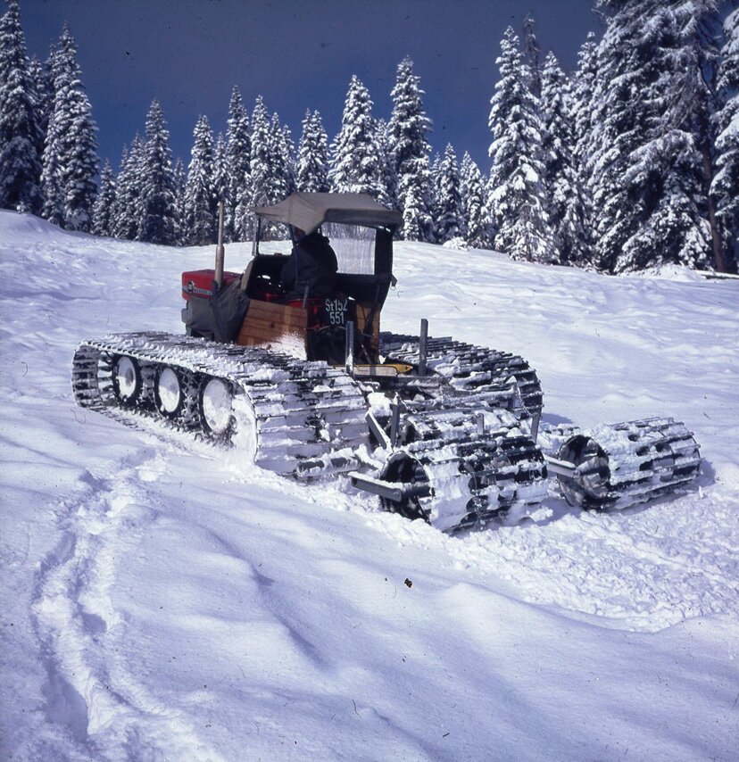 „Die vorhandenen Gitterräder wurden mit breiteren Brettern versehen und die Vorderräder auf Ski gestellt“, gibt Rudi einen Einblick in die erste Konstruktion. Dieser Versuch funktionierte zwar auf ebenem Untergrund, aber an eine Präparierung bergauf war nicht zu denken. Dafür musste ein Raupenfahrzeug her.