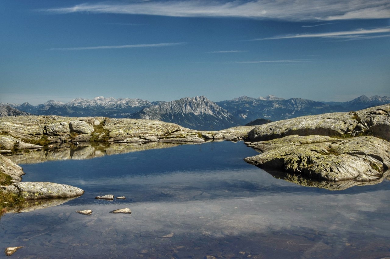Nach insgesamt knapp 3 h erreicht man größten See, der das „Ziel“ der Goldlacken bildet. Als ich meine wohlverdiente Jause auf einem Felsen am Ende der Lacke ausbreitete und dabei in die Hocke ging, staunte ich nicht schlecht: Von dieser Perspektive wirkt der See in der Tat wie ein Infinity Pool inmitten der Alpen. Dahinter streckt sich der Grimming empor und so konnte ich fast bis nach Hause sehen.