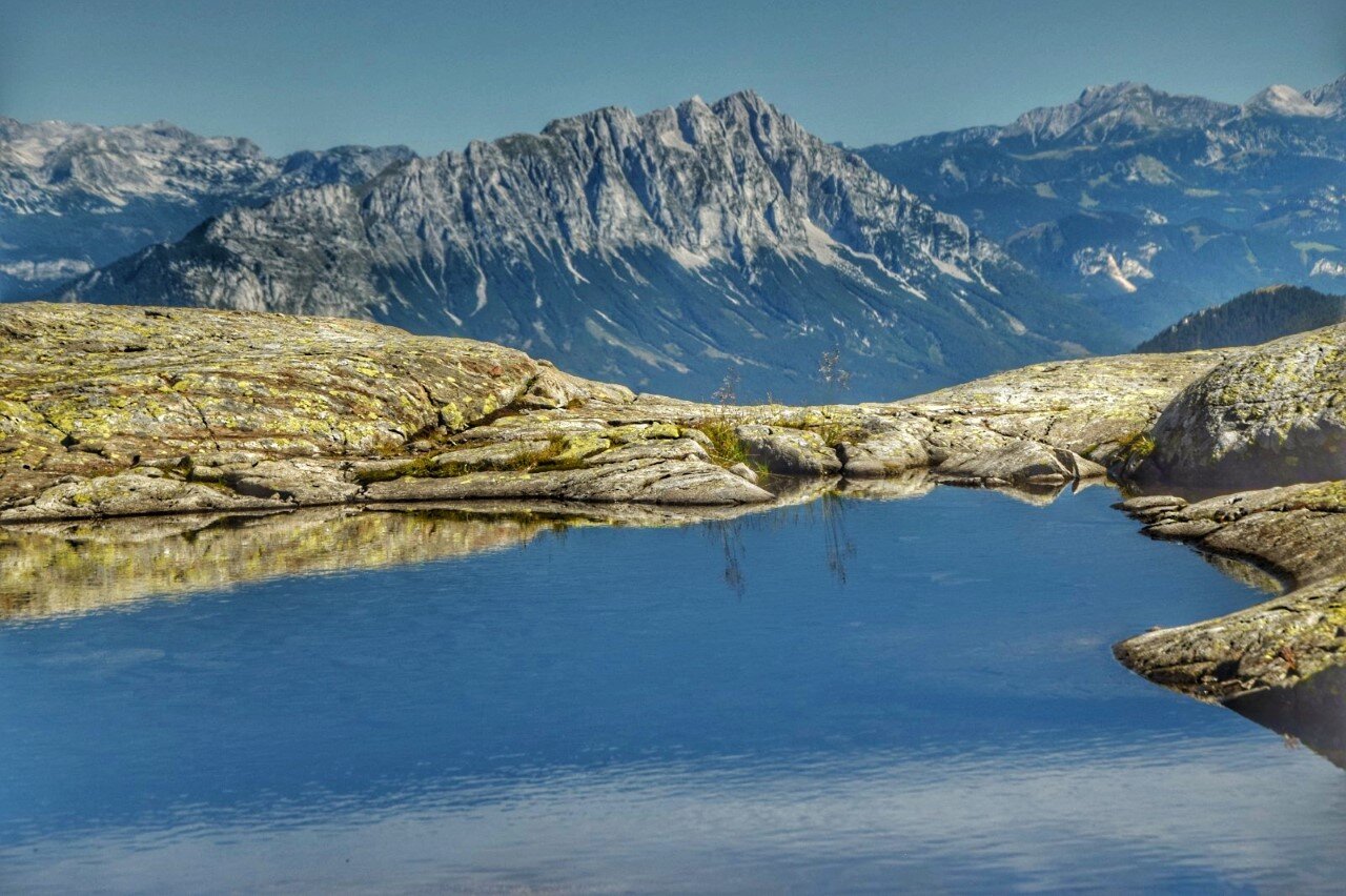 Eine Vielzahl von kleineren, glasklaren Gebirgsseen am Fuße der Hochwildstelle im Sattental sind namensgebend für die Goldlacken. Von manchen werden sie als die „kleinen“ Klafferkessel bezeichnet, mich persönlich erinnert ihr Anblick, aufgrund der besonderen Lage am Fels, an einen Infinity-Pool mitten in den Alpen. In diesem Blogbeitrag nehme ich Dich mit auf die Wanderung zu diesem Geheimtipp in der Region Schladming-Dachstein.