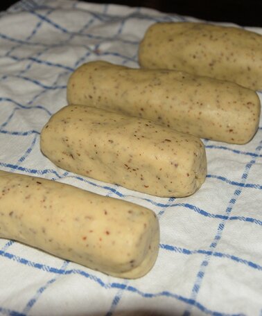 2. Im nächsten Schritt geht es ans Formen der Kipferl. Dafür fertigen wir aus dem Teig 2-3 cm dicke Rollen, von denen wir kleine Stückchen abschneiden, fest zu länglichen Stangerl rollen und zu Kipferl formen.