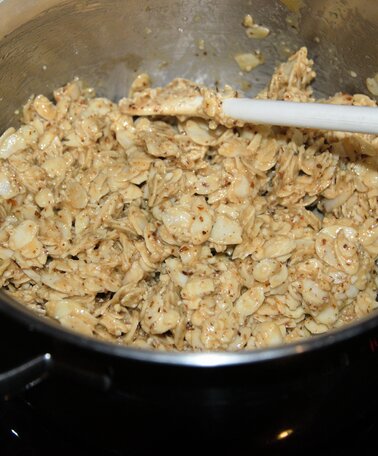 1. Im ersten Schritt werden in einem Topf Honig, Zucker, Butter und Schlagobers für 5 Minuten aufgekocht, ehe wir die Mandelblättchen und geriebene Mandeln zur Masse geben und alles gut vermengen.