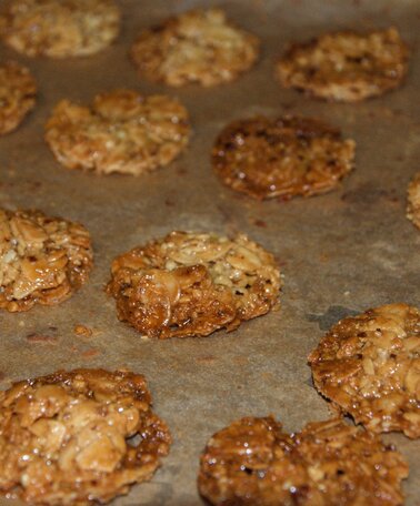 2. Anschließend werden mit zwei Löffeln kleine Häufchen geformt und bei 180 Grad 10-15 Minuten karamellisiert. Sollte der Teig auseinanderlaufen und die Kekse so ihre Form verlieren, können aus der warmen Masse auch Kreise ausgestochen werden.