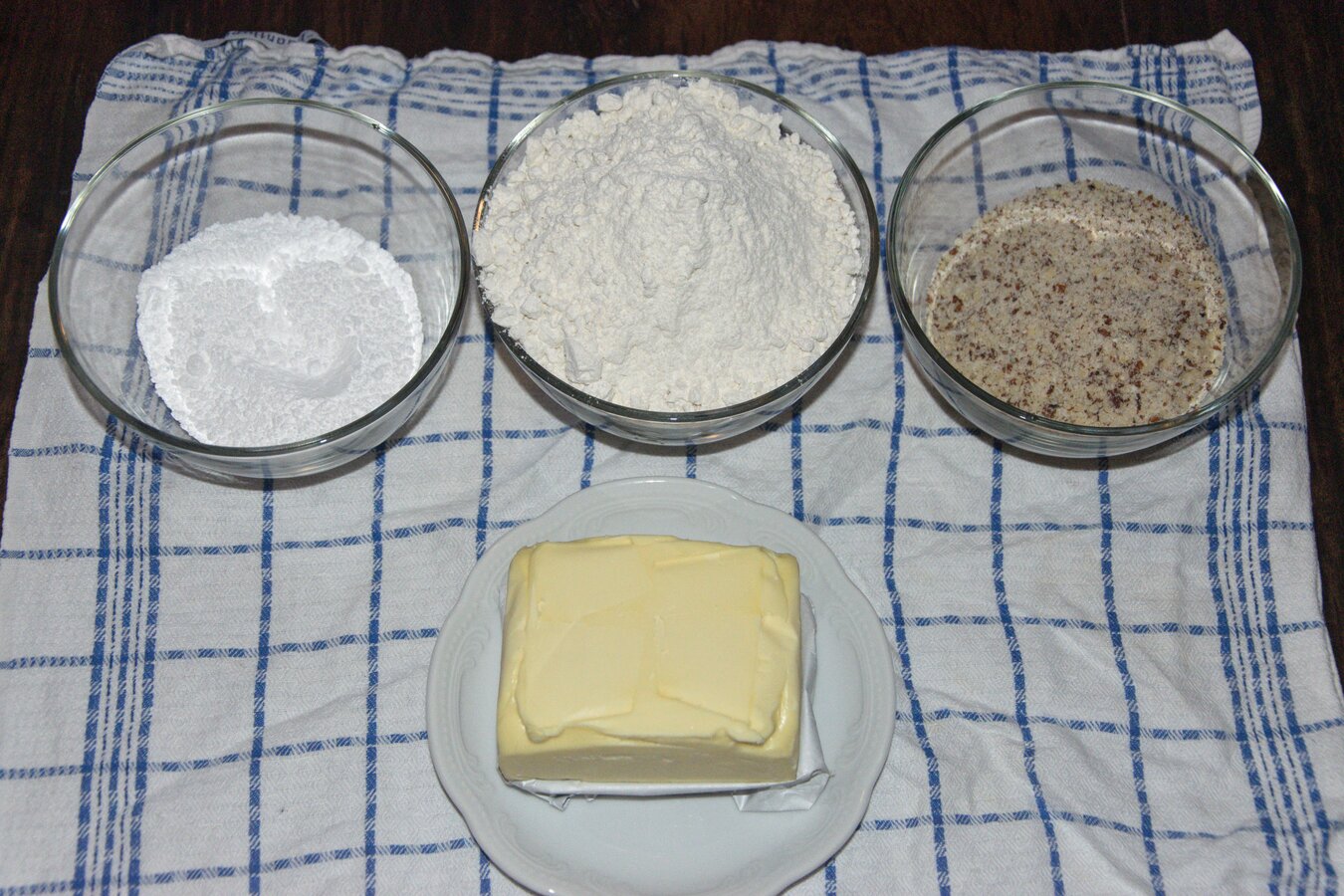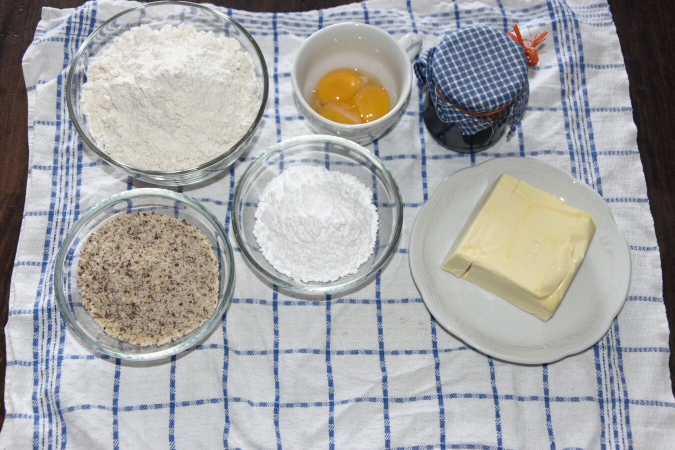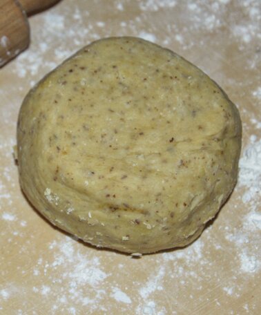 1. Für den Mürbteig schneiden wir zuerst die kalte Butter in kleine Stückchen und verkneten sie mit dem Mehl, bis keine Butterstücke mehr zu sehen sind. Anschließend werden die restlichen Zutaten beigemengt und alles zu einem Teig verarbeitet.