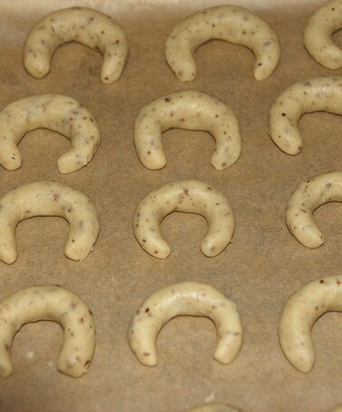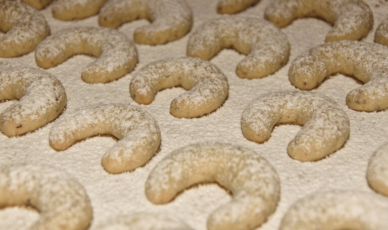 3. Bei 180 Grad kommen die Kipferl für etwa 10 Minuten in den Ofen, bis sie leicht gebräunt sind. Zum Schluss werden die lauwarmen Kipferl in einer Mischung aus Staub- und Vanillezucker bestreut bzw. gewälzt.