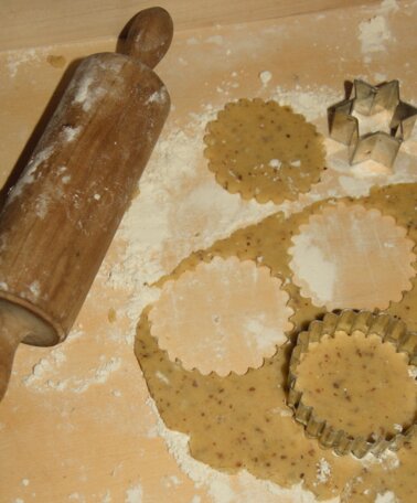 2. Nachdem unser Teig eine Stunde gerastet hat, wird er auf einer bemehlten Fläche ausgerollt und es werden Kreise ausgestochen. Die Hälfte der Kreise bildet die „Böden“, während aus der anderen Hälfte, den „Deckeln“, in der Mitte ein Stern oder ein weiterer kleiner Kreis ausgestochen wird. Bei 180 Grad werden die Kekes 10 Minuten gebacken.