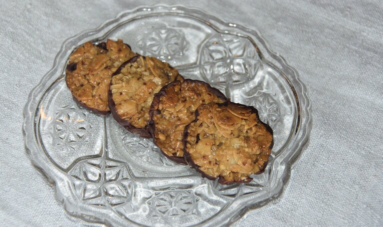 3. Nachdem die Florentiner ausgekühlt sind, werden sie noch an der Unterseite in flüssige Schokolade getaucht.