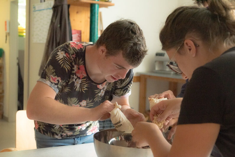 Nach einem gemeinsamen Frühstück startet jeder mit seinen Aufgaben. Am liebsten, so berichten die 3, beschäftigen sie sich mit dem Unkrautjäten sowie dem Pikieren. An dem Tag unseres Besuches stand die Befüllung von Zirbensackerln im Rahmen unserer Kooperation am Programm. Der Stamm einer Zirbe aus der Region wurden zunächst gehobelt, ehe die Späne mit duftendem Zirbenöl versehen und anschließend von Magdalena, Isabella und Elias sorgfältig in Sackerl gefüllt und verschlossen wurden.