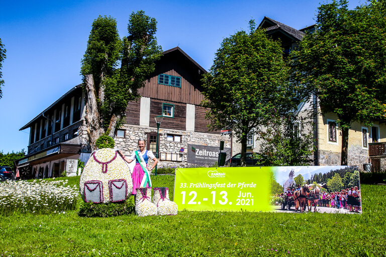In Ramsau am Dachstein würde unter normalen Umständen wieder das “Frühlingsfest der Pferde” stattfinden. Das Highlight der beliebten Traditionsveranstaltung in der Tourismusregion Schladming-Dachstein bilden alljährlich die von Pferden gezogenen, liebevoll gesteckten Blumenfiguren, begleitet von viel Folklore, Musik und Tanz. Sämtliche Feierlichkeiten müssen heuer leider entfallen - die spektakulären Blumenfiguren werden aber trotzdem gesteckt und auf dem Dorfplatz Ramsau aufgestellt. Auch die Dachstein Hoheiten, die normalerweise beim Frühlingsfest ihr Können beweisen dürfen und anschließend von einer Ramsauer Jury gekürt werden, verlängern ihr Ehrenamt um ein weiteres Jahr. Somit steht der Pferdegemeinde Ramsau am Dachstein ein weiterer erfolgreicher Sommer bevor.