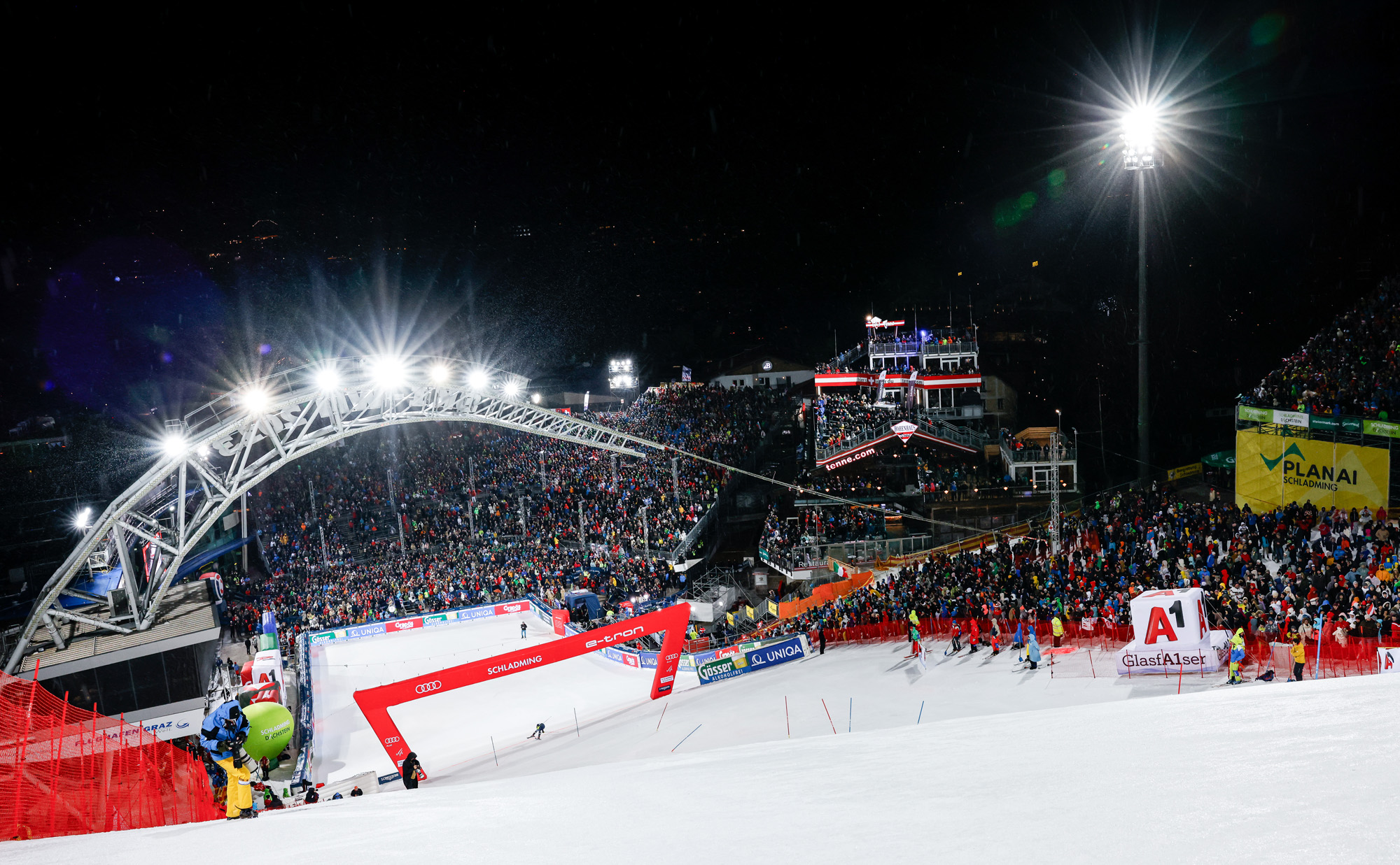 Die Stimmung im Planai Stadion ist einzigartig, sobald sich der erste Athlet aus dem Starthaus auf die Weltcuppiste stürzt. Hier wird die Nacht zum Tag - das sollte man auf keinen Fall verpassen!