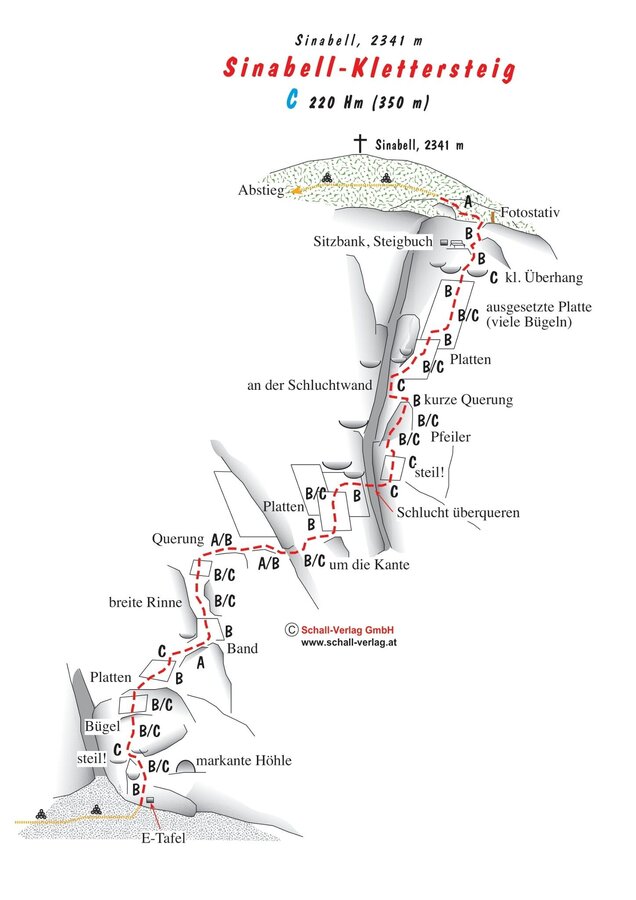 Östlich vom Guttenberghaus erstreckt sich die Südwand des Sinabells. Der gut angelegte, mittelschwere Klettersteig ist an manchen Stellen ziemlich ausgesetzt und steil, aber mit vielen Trittbügeln "entschärft". Vormittags liegt die schöne, südsüdwestlich ausgerichtete Wand des Sinabells im Schatten, nachmittags leuchtet die Sonne in die Wand. Als kleines Highlight befindet sich knapp unter dem Ausstieg das Wandbankerl mit Wandbuch und eine Wiese lädt mit grandiosem Ausblick zum Rasten ein.