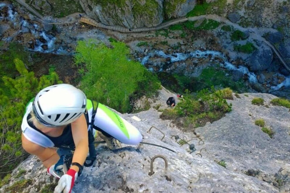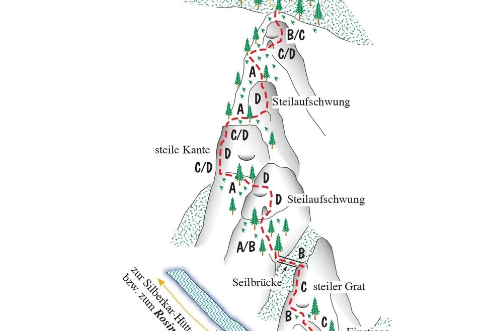 * Unbedingt immer ein Klettersteigset und einen Helm verwenden und im Sicherungsseil einhängen. Viele Bergrettungseinsätze sind auf Leichtsinn und schlechtes Wetter zurückzuführen.