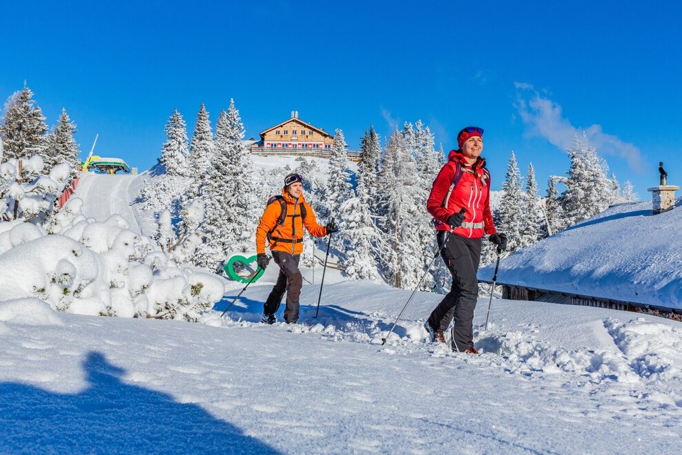 Auf dieser beliebten Tour folgst Du der Aufstiegsspur entlang der Piste Nr. 33 und steigst anschließend links (östlich) von der Piste weiter aufwärts Richtung Hochwurzen. Vorbei an der Bergstation der Obertalbahn und der Seiterhütte erreichst Du den Gipfel auf 1.850 m – mitsamt der beliebten Hochwurzenhütte.
