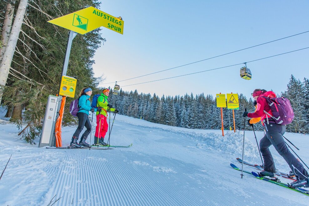 Tagsüber verläuft die Aufstiegsroute am östlichen Rand der Piste Nr. 33. Ab der Talstation Gipfelbahn Hochwurzen steigst Du über eine eigens angelegte Spur am linken (östlichen) Pistenrand bis zur Bergstation der Obertalbahn auf. Über die kleine Ebene querst Du zur Seilbahntrasse der Gipfelbahn wo nun eine eigens angelegte Aufstiegsspur durch den Wald oberhalb der Piste Nr. 33 beginnt. Diese ist viel begangen, gut erkennbar und auch ausgeschildert. Mit einigen Spitzkehren bietet sie Dir zudem die Möglichkeit Deine Technik weiter zu verbessern!