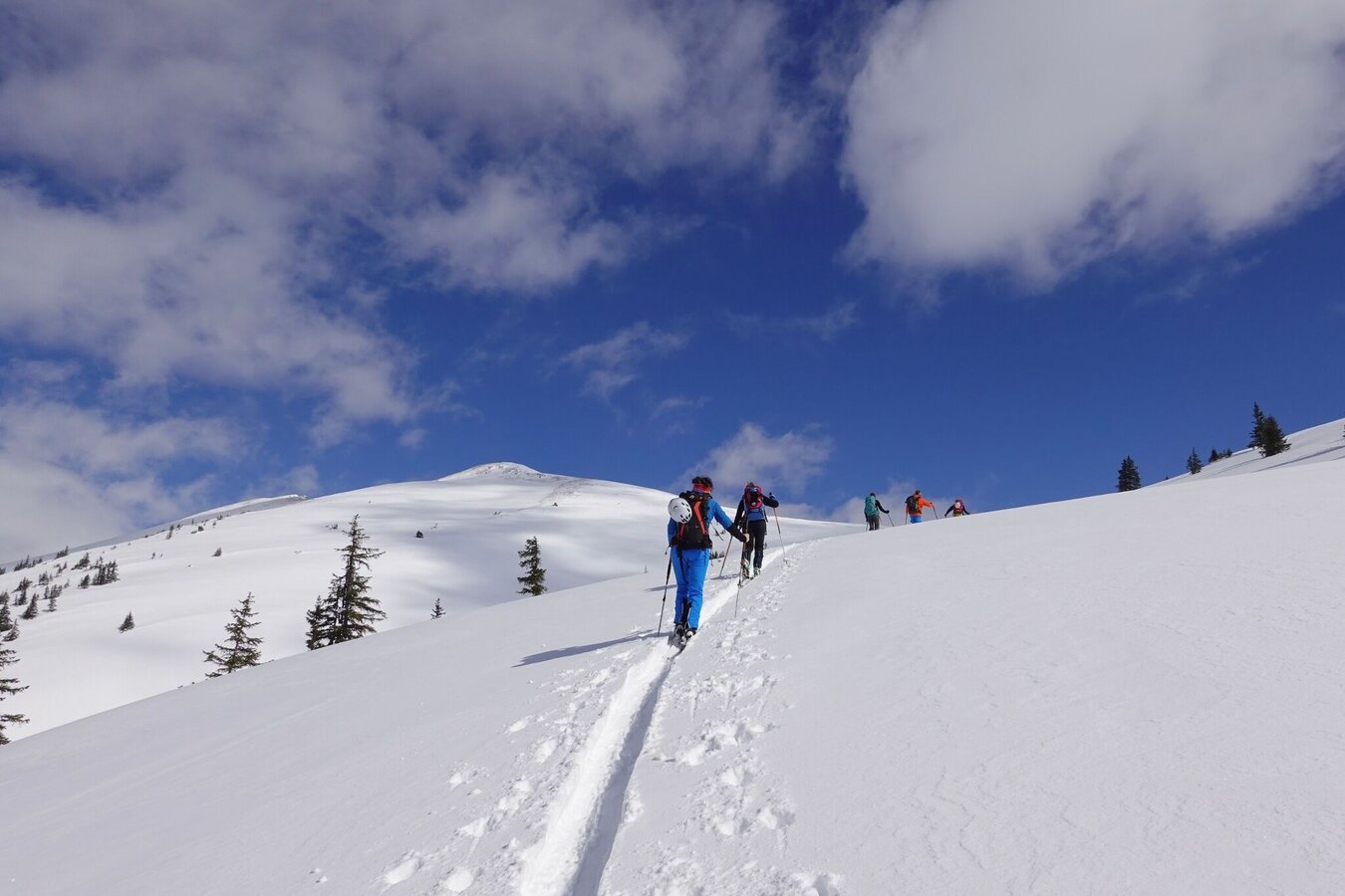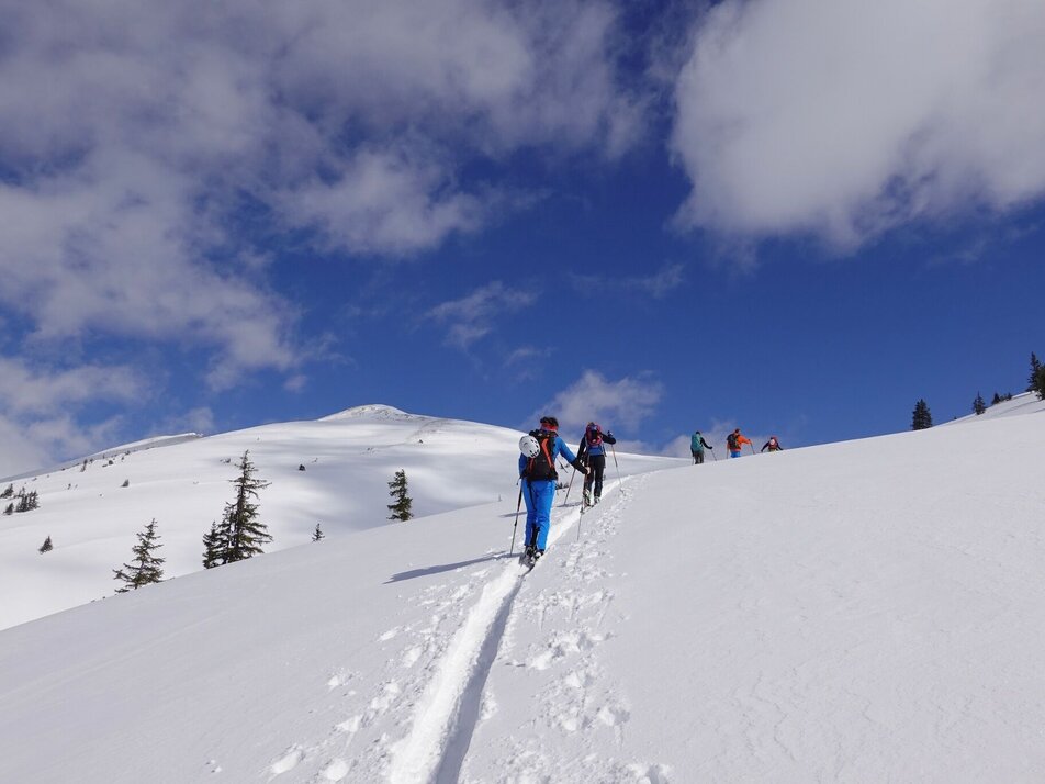 Die Skitour beginnt bei der Talstation des Gläserbodenliftes. Du entscheidest, ob Du bis zum Gläserboden neben der Skipiste aufsteigst oder die gemütliche Variante mit dem Lift nimmst. Bei der Bergstation wendest Du dich ostwärts und gehst bis zur kleinen Scharte vor dem Großen Rotbühel. Abfellen, denn von da folgt eine steile Abfahrt in den Plientensattel hinunter. Für den folgenden Aufstieg auf die Hintergullingspitze spannst Du deine Felle wieder auf. Du kannst auch auf den Gipfel verzichten und den Gipfelaufbau unterhalb queren. In leichtem Auf und Ab erreichst Du schließlich den Kreuzberg. Abgefahren wird nach Westen, bis Du die nicht geräumte Forststraße erreichst. Dieser folgst Du bis zur Lärchkaralm und weiter nach Hinterwald in Donnersbachwald.