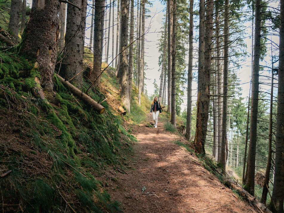 Du startest vom Parkplatz in der Ortsmitte und gehst der Beschilderung folgend bis zur Wiese und danach bergauf in den Wald. Den Waldweg marschierst du nun entlang bis zur Forststraße, auf der du wieder bergab zurück in den Ort kommst.