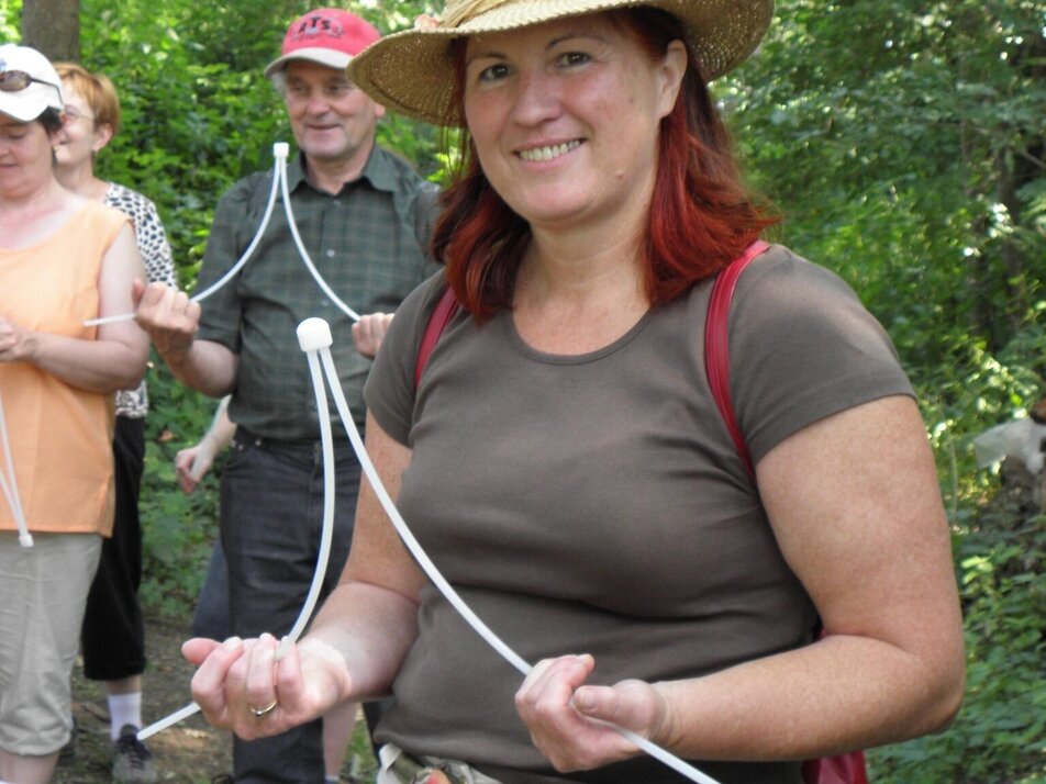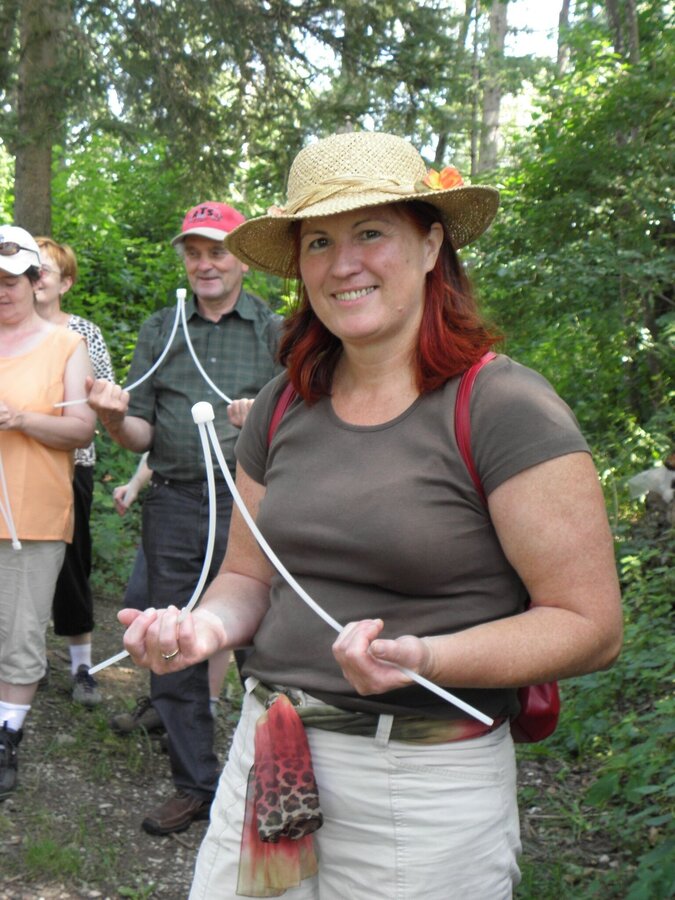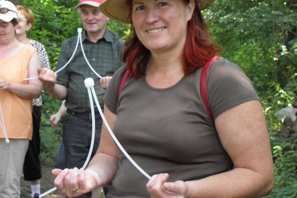 Legen Sie die Ellenbogen an die Taille, sodass die Handinnenfl ächen nach oben zeigen. Führen Sie nun die Rutenschenkel zwischen Kleinen- und Ringfinger beim zweiten Fingerglied durch. Die Enden der Rute laufen zwischen Daumen und Zeigefinger hinaus. Ringfinger und kleiner Finger umgreifen nun die Rute bei der gewünschten Markierung. Schließen Sie nun die Hände fest zusammen. Vergleichen Sie Ihre Haltung mit der Darstellung im Foto. Um einen Ausschlag zu bekommen, müssen Sie die Rute unter Spannung (Druck von außen nach innen) setzen. Probieren Sie so fest zu drücken, bis die Rute sich nach oben oder unten bewegt. Üben Sie diesen künstlichen Ausschlag mehrmals.