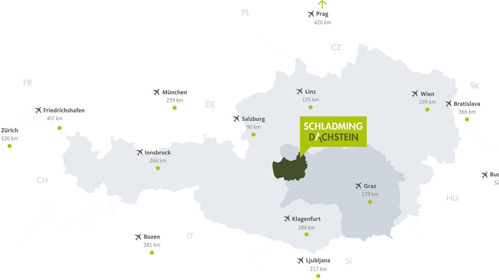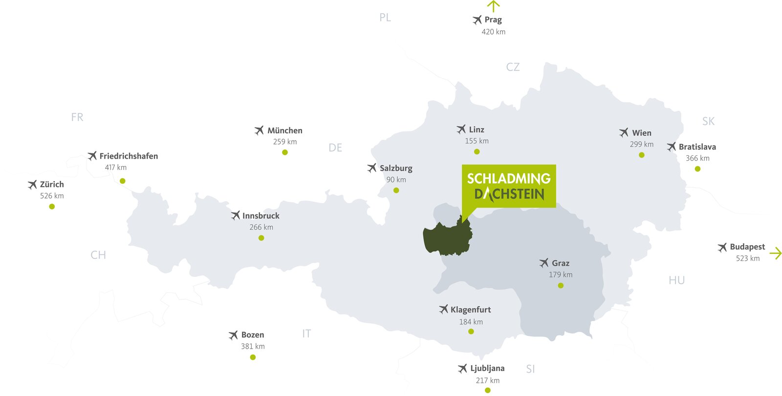Im wunderschönen Ennstal, erstreckt sich die Region zwischen Mandling und Wörschach und hat jeweils Anschluss an internationale Schnellzugverbindungen am Bahnhof Schladming und Stainach/Irdning.