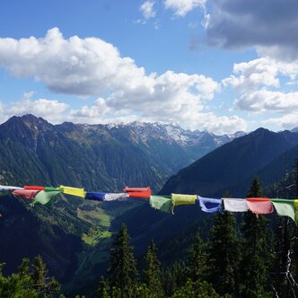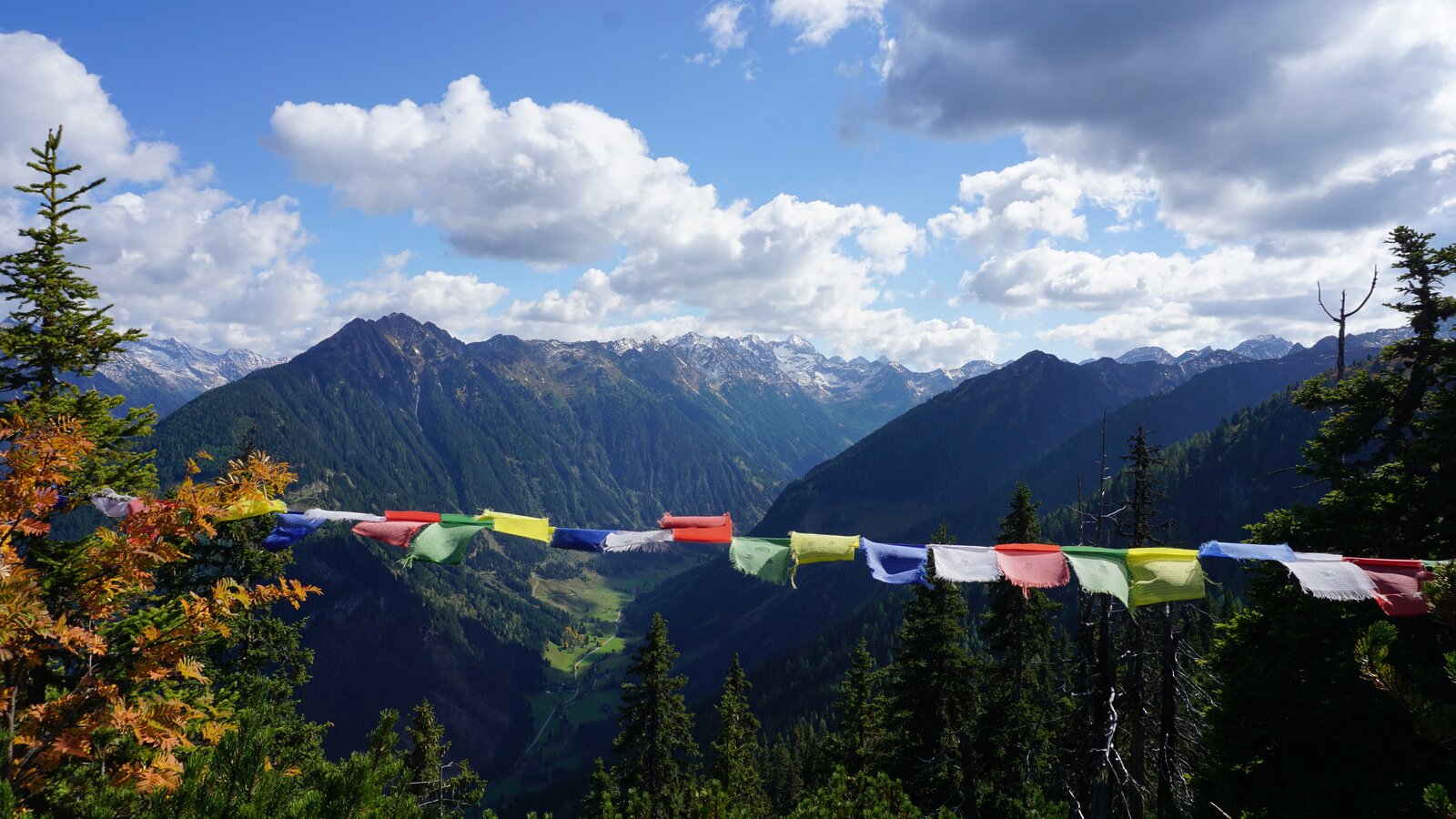 Nach Erreichen des kleinen Hochwurzen findet man hier ein grandiosen Blick auf die umliegenden Berge einschließlich der Gebetsfahnen die einen zum träumen einladen.