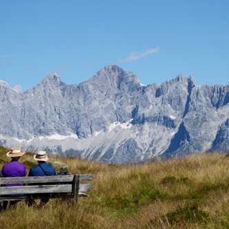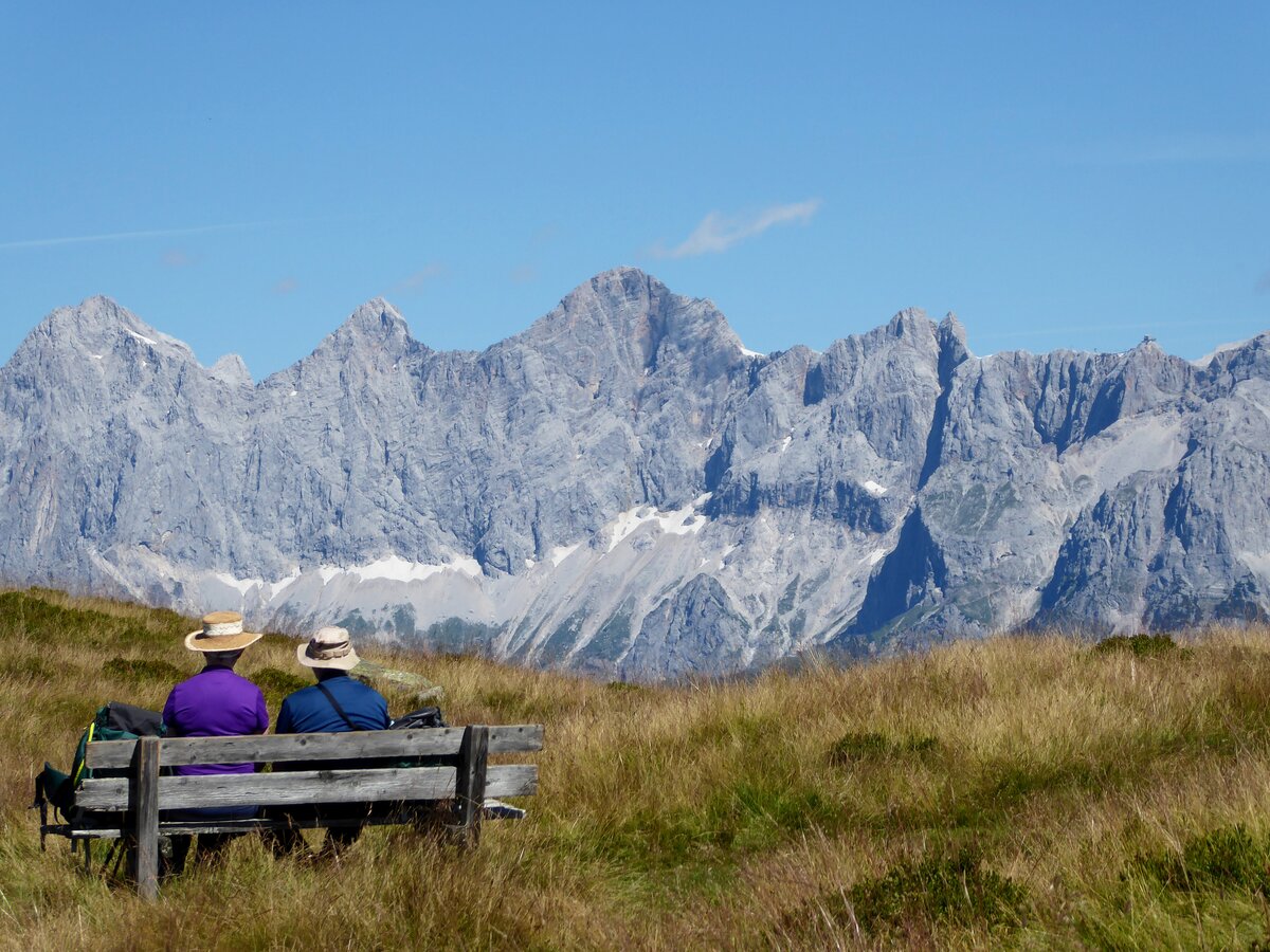Gipfelglück mit Gipfelblick auf den imposanten Dachstein. Wo schöner könnte diese Bank stehen?