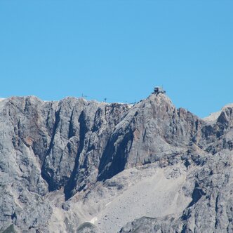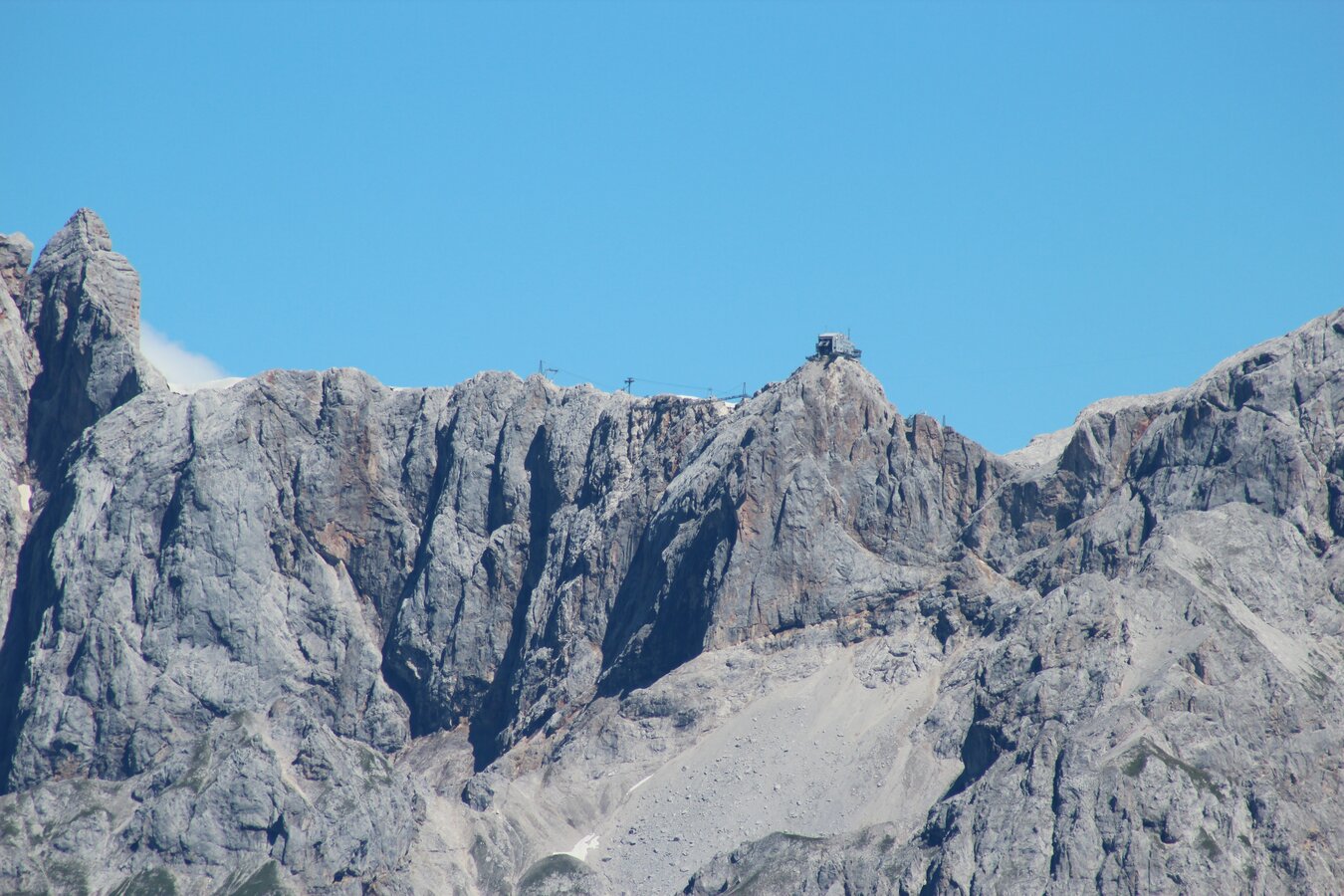 Schon beim Aussteigen in der Bergstation ist der Blick auf das mächtige Dachsteinmassiv atemberaubend.