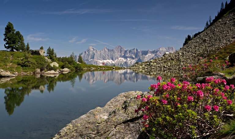 Tipp: Zur Zeit der Alpenrosenblüte (Juni/Juli) ist der Spiegelsee in ein Meer aus Blüten eingbettet.