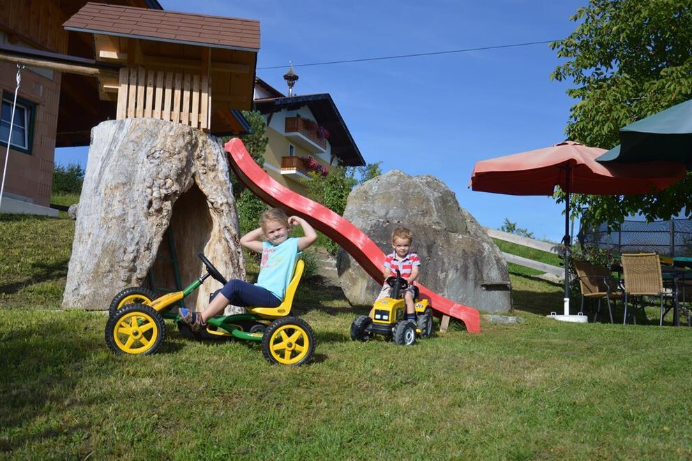 Ein besonderes Anliegen sind uns unsere kleinsten Gäste. Während die Eltern gemütlich im Garten sitzen oder unsere Liegewiese nützen, können sich die Kinder am Spielplatz mit Schaukel, Rutsche, Kletterhäuschen und Riesentrampolin austoben. Mit den Gokarts und Trettraktoren können Ihre Kinder unseren Garten ebenfalls „unsicher“ machen. Das größte Erlebnis für jedes Kind ist aber die vielfältige Tierwelt auf unserem Bauernhof. Ein Besuch im Stall bei unseren Kühen und Enten fasziniert jedes Kind. Und unsere Katzen, Hasen und Ziegen freuen sich schon auf viele Streicheleinheiten.